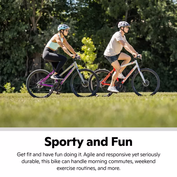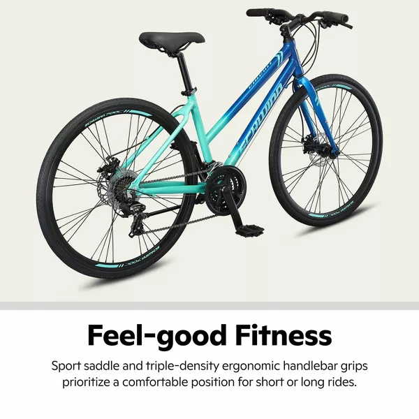 Exercise doesn't have to be a chore... hit those fitness goals and have fun along the way with the 700c Circuit by Schwinn, a sport hybrid bike that's agile and responsive yet seriously durable. Thanks to the light aluminum fitness frame, a rigid road suspension fork and 21-speed Shimano EZ-Fire shifters with a Shimano rear derailleur, the Circuit is speedy and agile for morning commutes and weekend getaway rides. Powerful mechanical disc brakes supply crisp, efficient stopping, while light and durable alloy rims support Schwinn sport tires to keep the ride smooth as silk. Toss in a cozy Schwinn fitness seat and triple-density ergonomic handlebar grips, and your new workout routine just got comfortable. The Circuit comes with a limited lifetime warranty for as long as you own the bike. Enjoy the freedom of riding a Schwinn!