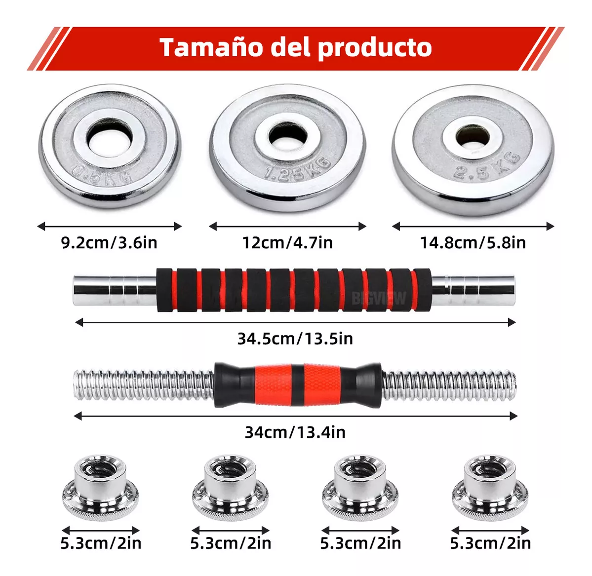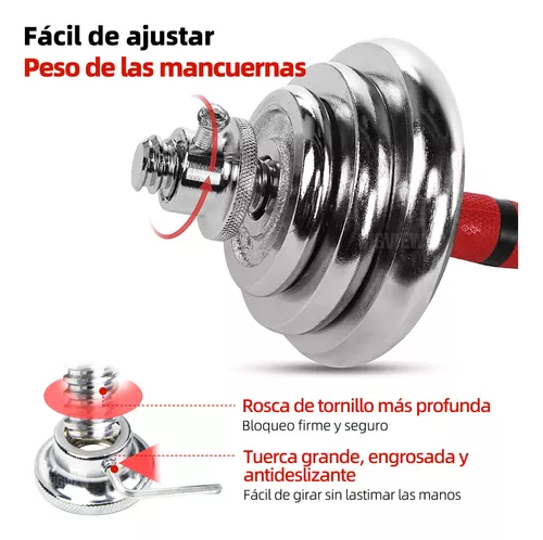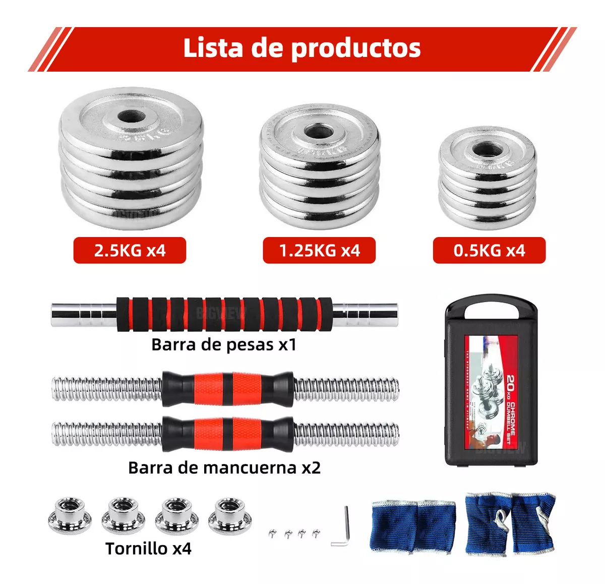 Este Kit De Pesas Gym Set Juego De Mancuernas Ajustable Ejercicio de la marca Bigview es ideal para tu rutina de entrenamiento en casa. Con un peso de 20 kg y recubrimiento de electroplating coating, wika te brinda durabilidad y resistencia. Sus mangos ergonómicos y antideslizantes garantizan un agarre cómodo y seguro durante tus ejercicios. Además, su diseño redondo y ajustable lo hace perfecto para cualquier tipo de ejercicio de fuerza. Aprovecha esta oportunidad para mejorar tu entrenamiento y alcanzar tus metas fitness.