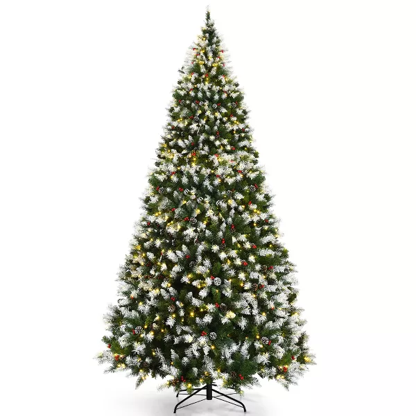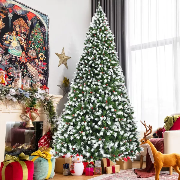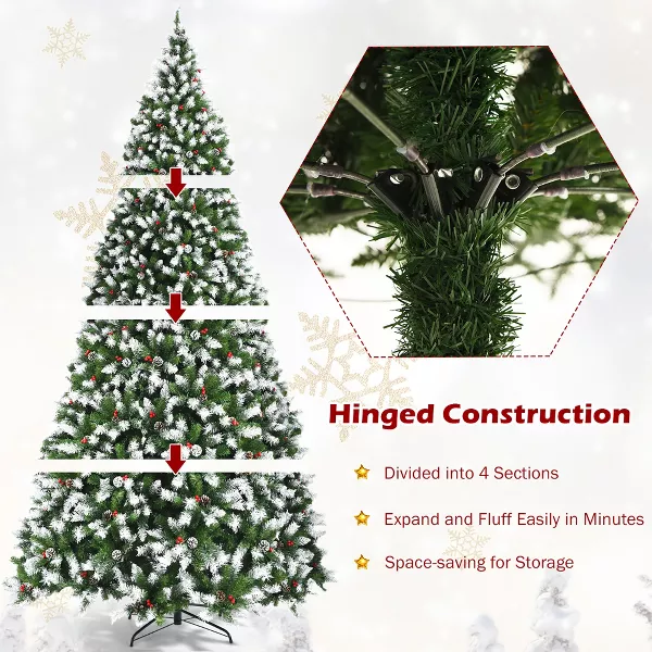 Eye-catching Christmas Decoration: Standing at 9 feet tall, this snow sprayed Christmas tree will attract all your attention when you see it. This artificial tree trimmed with pine cones and red berries associates with classic Christmas elements firmly. And you can decorate the Xmas tree with other ornaments (not included) to make it better.