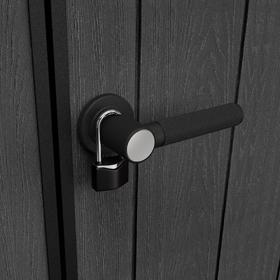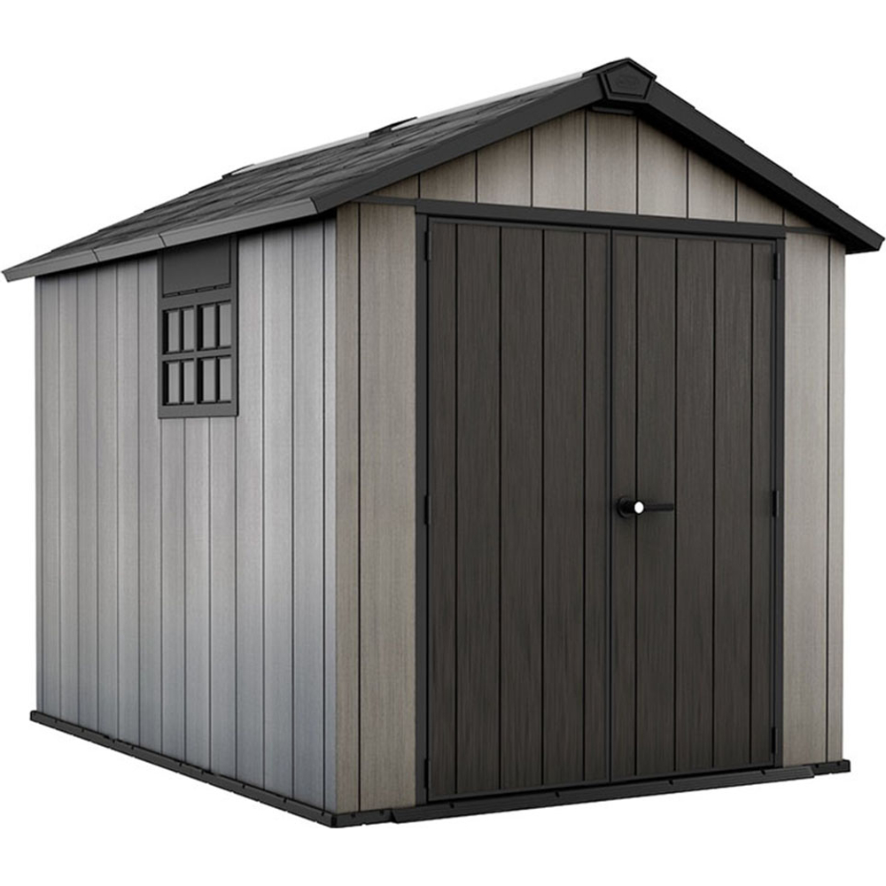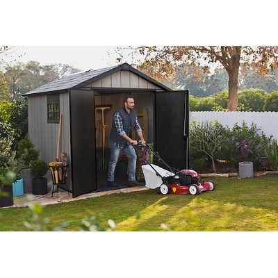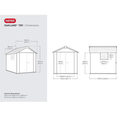 Depósito para exteriores línea oakland, marca keter, con apariencia a la vista y tacto de madera y al mismo tiempo libre de mantenimiento. Fabricado con la resina duotech, la tecnológicamente mas avanzada del mercado, 100% resistente al exterior y reciclable, color gris, sin embargo puede ser pintada en el color que usted guste. Grosor de paredes de 18 mm para mayor rigidez, además que sus paredes pueden ser taladradas para colgar sujetadores de estanterías o de herramientas. Con ventilas para circulación de aire, también cuenta con wika una ventana para permitir la entrada de luz, la cual puede ser instalada en cualquiera de sus paneles. Las puertas con herraje de acero inoxidable para cerrarse con candado (no incluido). Incluye piso como parte integral del producto, sin embargo, es necesario instalarlo sobre una superficie solida y nivelada. Fácil de ensamblar, solo se requiere cinta de medir, desarmador, taladro y una pequeña escalera. Tragaluz a todo lo largo del del techo.