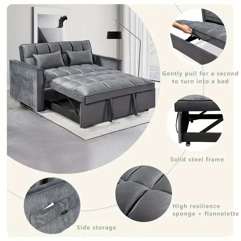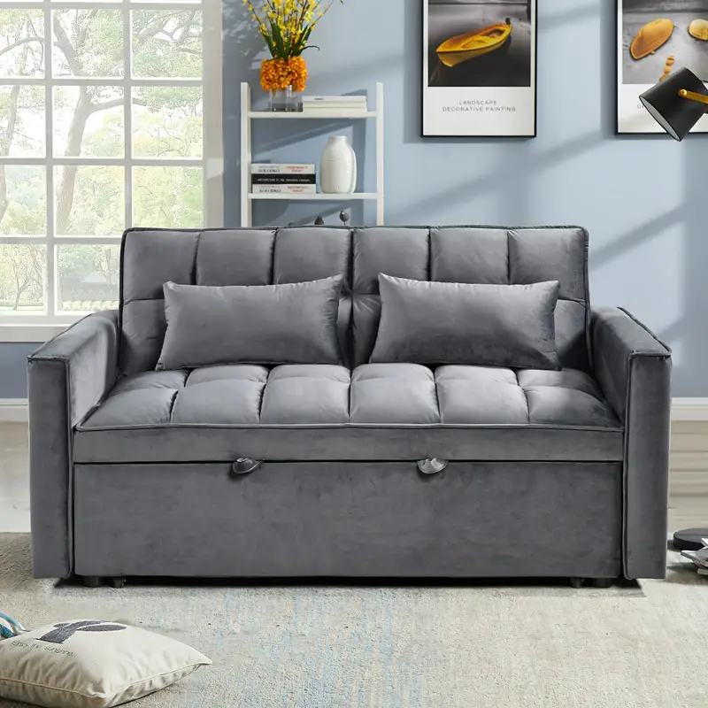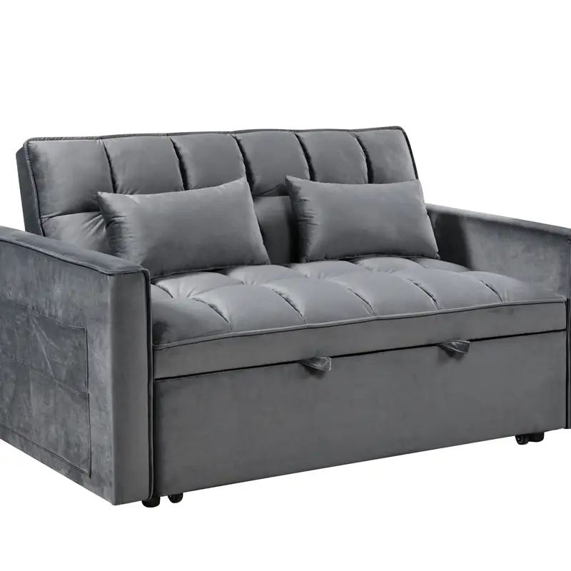 Diván Cama de Terciopelo Lujoso 3-en-1 con Respaldo Ajustable - Sofá Cama Doble Moderno, Bolsillos Laterales de Almacenamiento & Almohadas de Salón Incluidas - Estructura Metálica Elegante, Montaje Fácil, Gris, Sofá Cama Futón