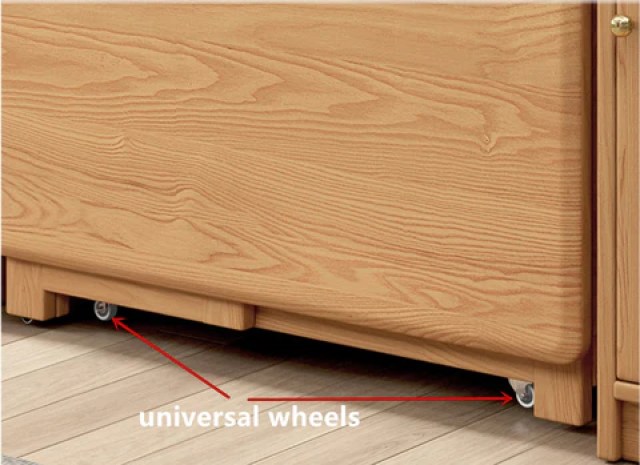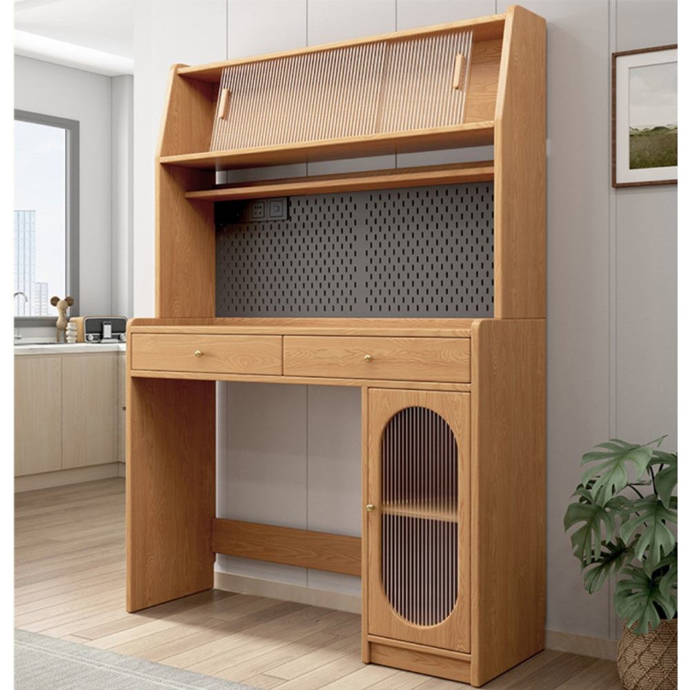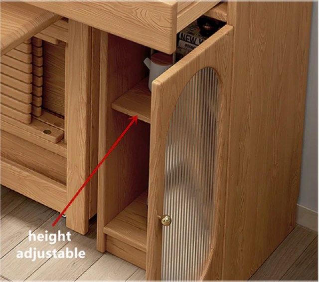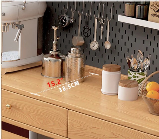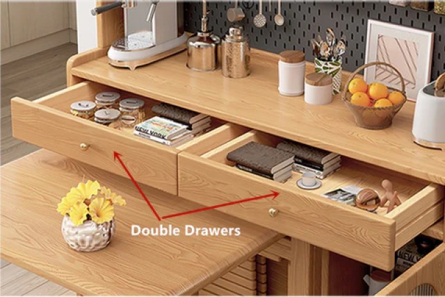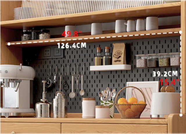 - El gabinete cuenta con múltiples estantes y cajones y un tablero perforado para guardar elementos esenciales de la cocina, como platos, cristalería y ropa de cama.