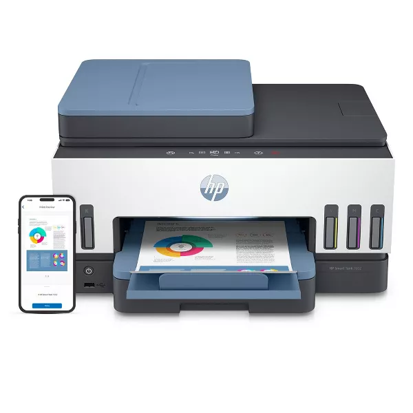 The HP Smart Tank 7602 refillable ink tank printer makes printing seamless from start to finish with an integrated, app-like magic touch panel, high-capacity ink tank, automatic document feeder and wireless and Ethernet connectivity. This supertank printer creates outstanding-quality color documents at a low cost with up to two years of Original HP Ink included in the box.