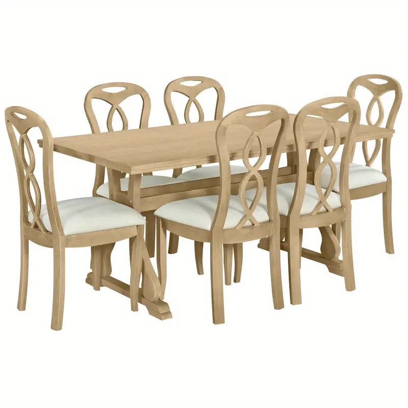 Un diseño bien elaborado: El juego de comedor presenta una sólida estructura de madera con una mesa central de caballete, diseñada para ofrecer un soporte duradero. Las patas curvadas y los soportes extendidos debajo de la mesa garantizan resistencia, mientras que las sillas acolchadas elevan tanto la comodidad como la elegancia.