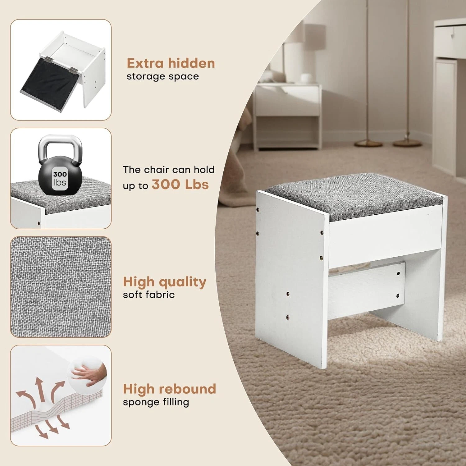 Taburete de Almacenamiento, Con Estación de Carga, Con Cajones, Con Soporte para Secador de Pelo, Con Espejo, Con Taburete, con Luces LED