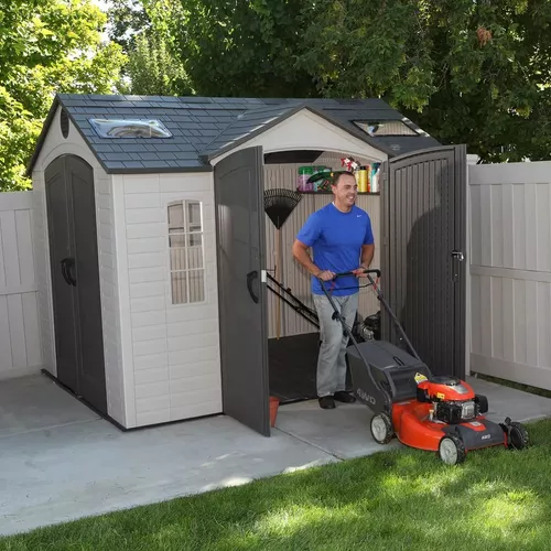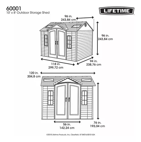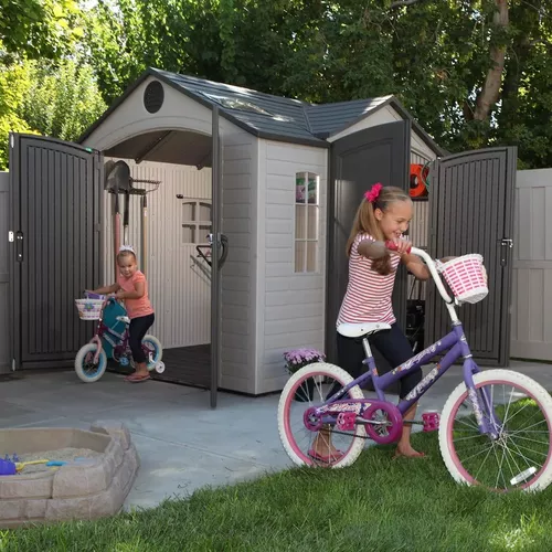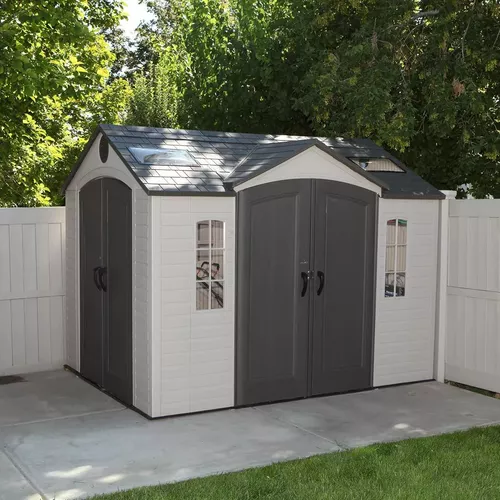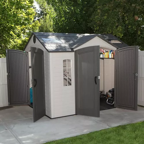 The 10-foot wide Sheds from Lifetime Products give you that extra space needed while accenting the beauty of your backyard. The centralized location of the wika doors provides easy storage access and the decorative shutters, molded wood-grain panels, and simulated shingled roof ensure an attractive design that will be the envy of your neighborhood.