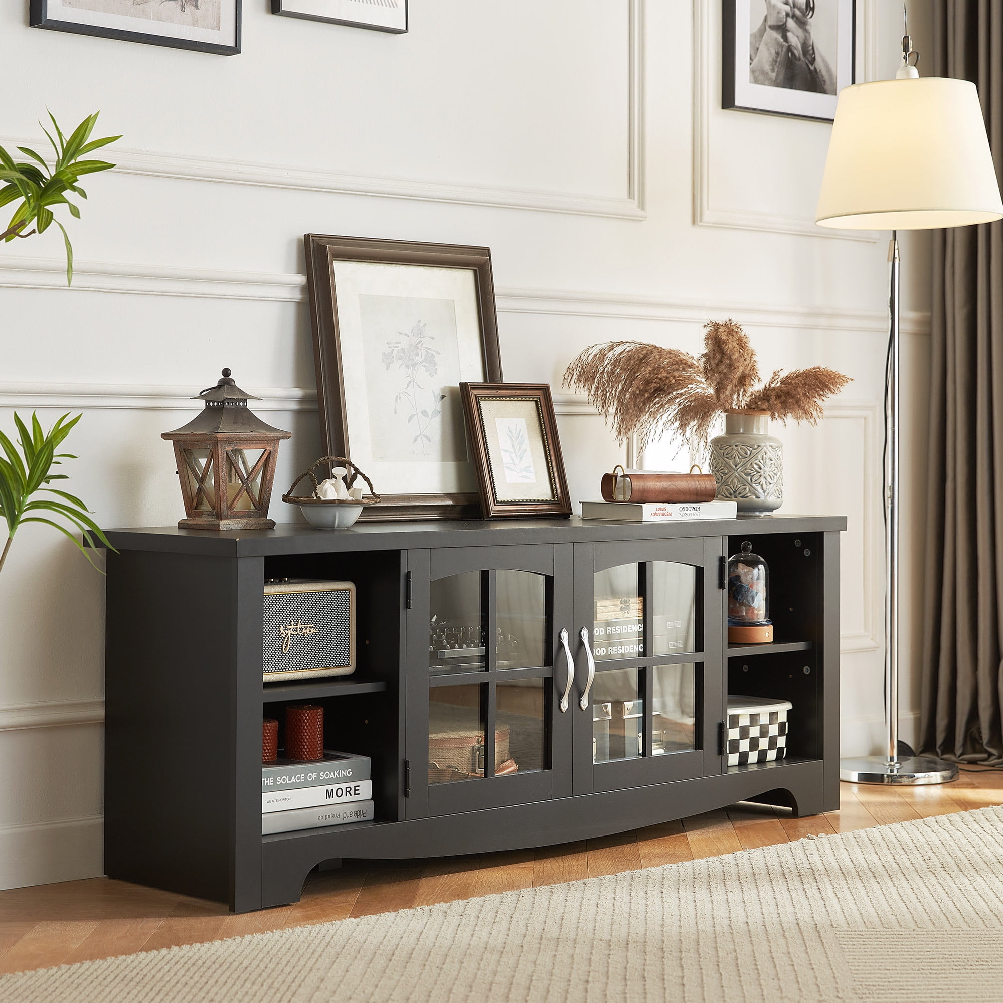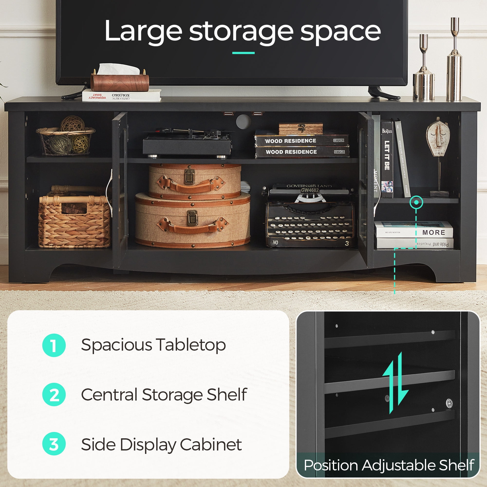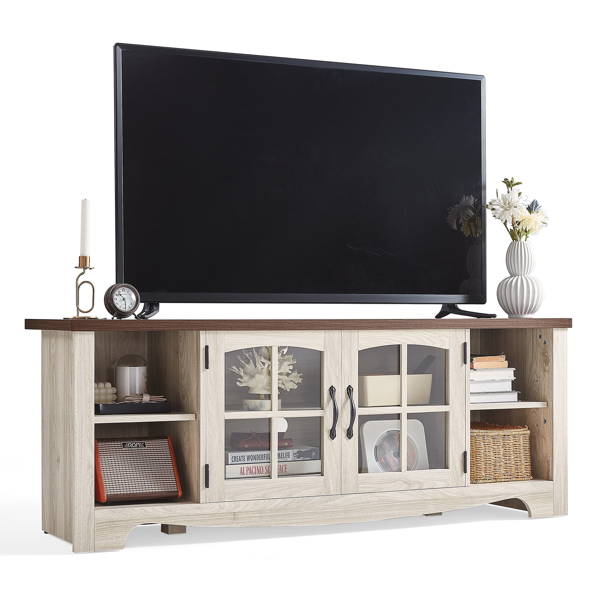 [DIGA ADIÓS AL DESORDEN DEL CENTRO DE MEDIOS] - Eleve su espacio vital separándose de los caóticos centros de medios con nuestros sofisticados soportes de televisión estilo granja. Logre organización con estantes ajustables, gabinetes laterales y dos espacios de exhibición con puertas de vidrio para sus accesorios de entretenimiento. Independientemente del tamaño de su sala de estar, este mueble para TV de 65 pulgadas es la personificación del refinamiento.