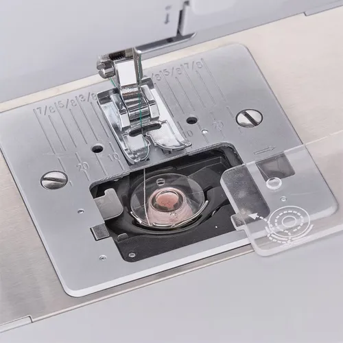 * Porta carrete horizontal que desenrolla el hilo de manera uniforme y mejora la calidad de las puntadas.