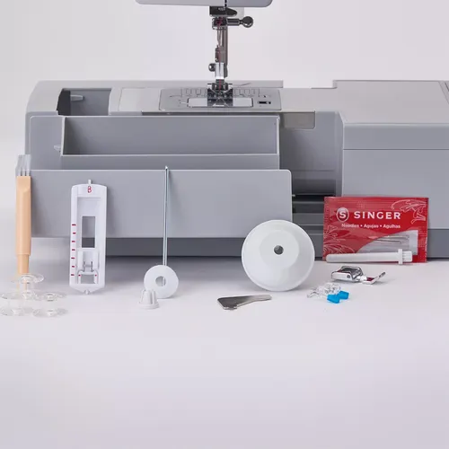 4 prensatelas, 4 bobinas, Agujas, Abreojales, Destornillador, Guía de acolchado, Fieltro, Porta bobina adicional, 2 sujetadores de hilo |
