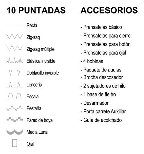 * 10 puntadas incluyendo utilitarias, flexibles y decorativas.