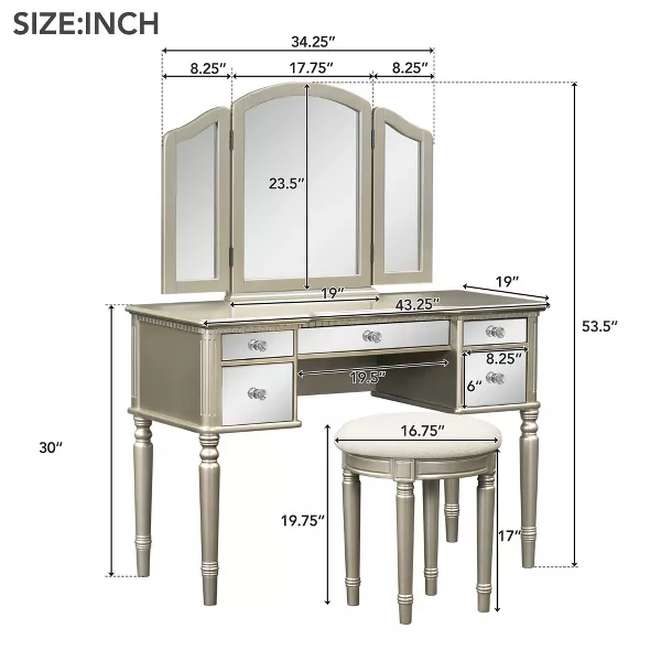 The adjustable tri-fold mirror ensures a perfect view from every angle, while five drawers including three velvet-lined compartments for jewelry offer ample storage.