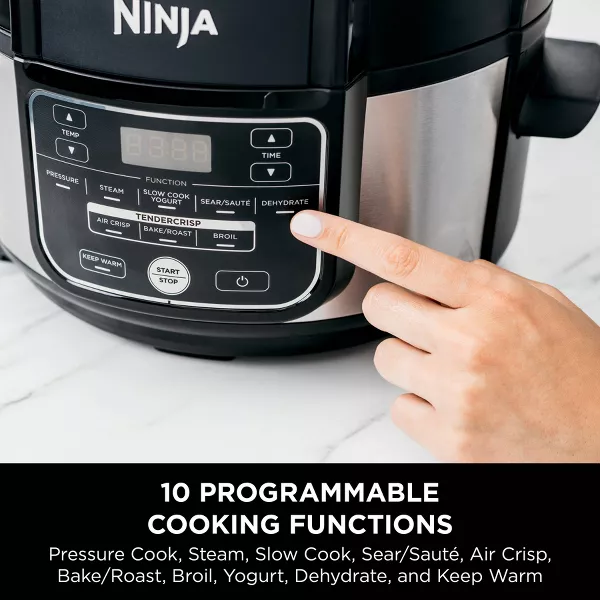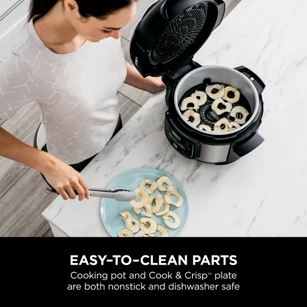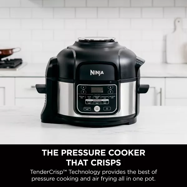 Meet the Ninja® Foodi® 9-in-1 5-qt Pressure Cooker + Air Fryer. TenderCrisp™ Technology lets you quickly pressure cook to lock in juices and then finish with a golden air fry crisp. 9-in-1 versatility lets you cook endless meal options. Nonstick 5-qt cooking pot holds a 4-lb chicken and the Cook & Crisp™ Plate holds up to 4 qts of your guilt-free fried food favorites.