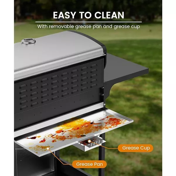 Easy to Clean: The full-size pull-out grease tray design effectively collects grease and residue during cooking, keeping the grill clean. Additionally, the pull-out design makes the cleaning process quick and easy. Simply pull out the tray, dispose of the grease, clean it, and place it back in position. This not only offers convenience but also ensures the grill's long-term performance and maintenance of its appearance
