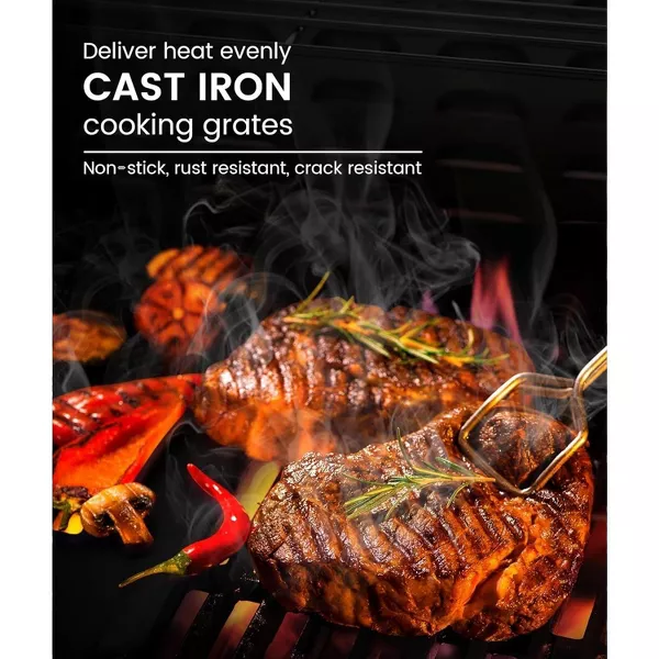 Ample Cooking Space: A total of 575 square inches of cooking space, including a 415 square inch porcelain-enameled cast iron cooking grate and a 160 square inch chrome-plated warming rack, provides plenty of cooking area, making it perfect for hosting BBQ parties with friends and family