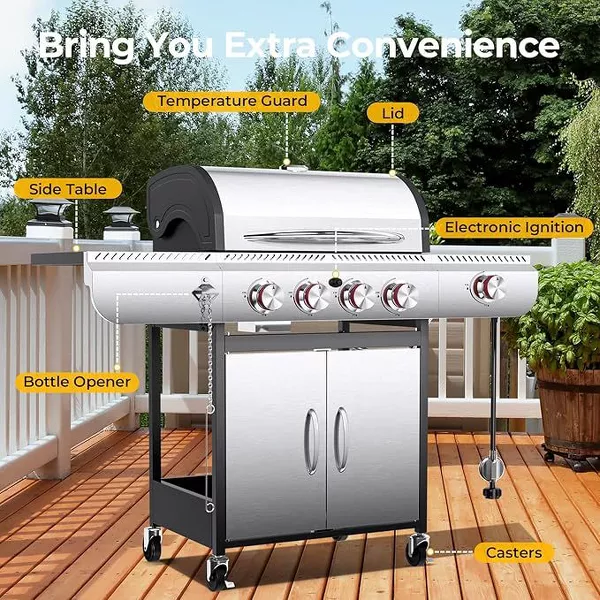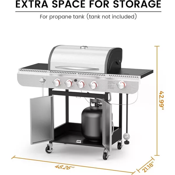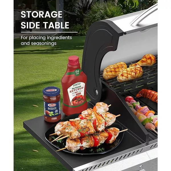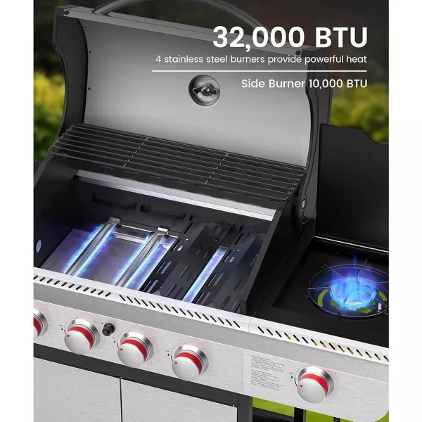 Grill and Side Burner: This propane gas grill features 4 main burners (8,000 BTU each) and a covered side burner (10,000 BTU). With a total output of 42,000 BTUs from 5 stainless steel burners, precise heat control is achieved through a battery-powered electronic ignition system