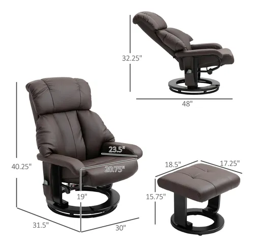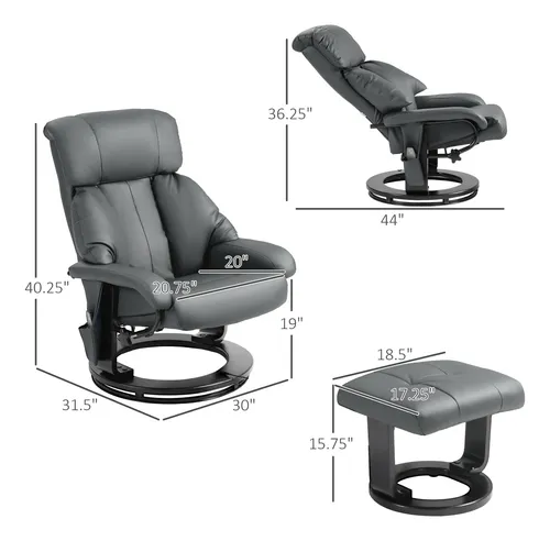 Silla de masaje con otomana Información: Tamaño vertical: 30 W x 31.5 D x 40.25 H. Tamaño reclinable: 44 L x 31 W x 36.25 H. Requiere montaje.