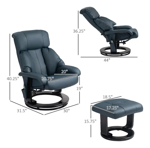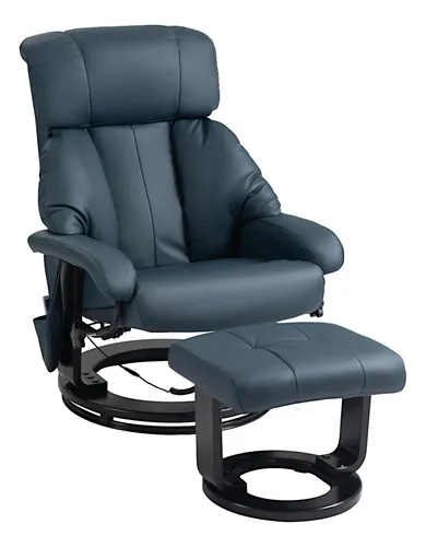 Silla reclinable de masaje con otomana, reclinable giratorio de 360° y reposapiés, silla reclinable de piel sintética con bolsillo lateral y control remoto, color azul