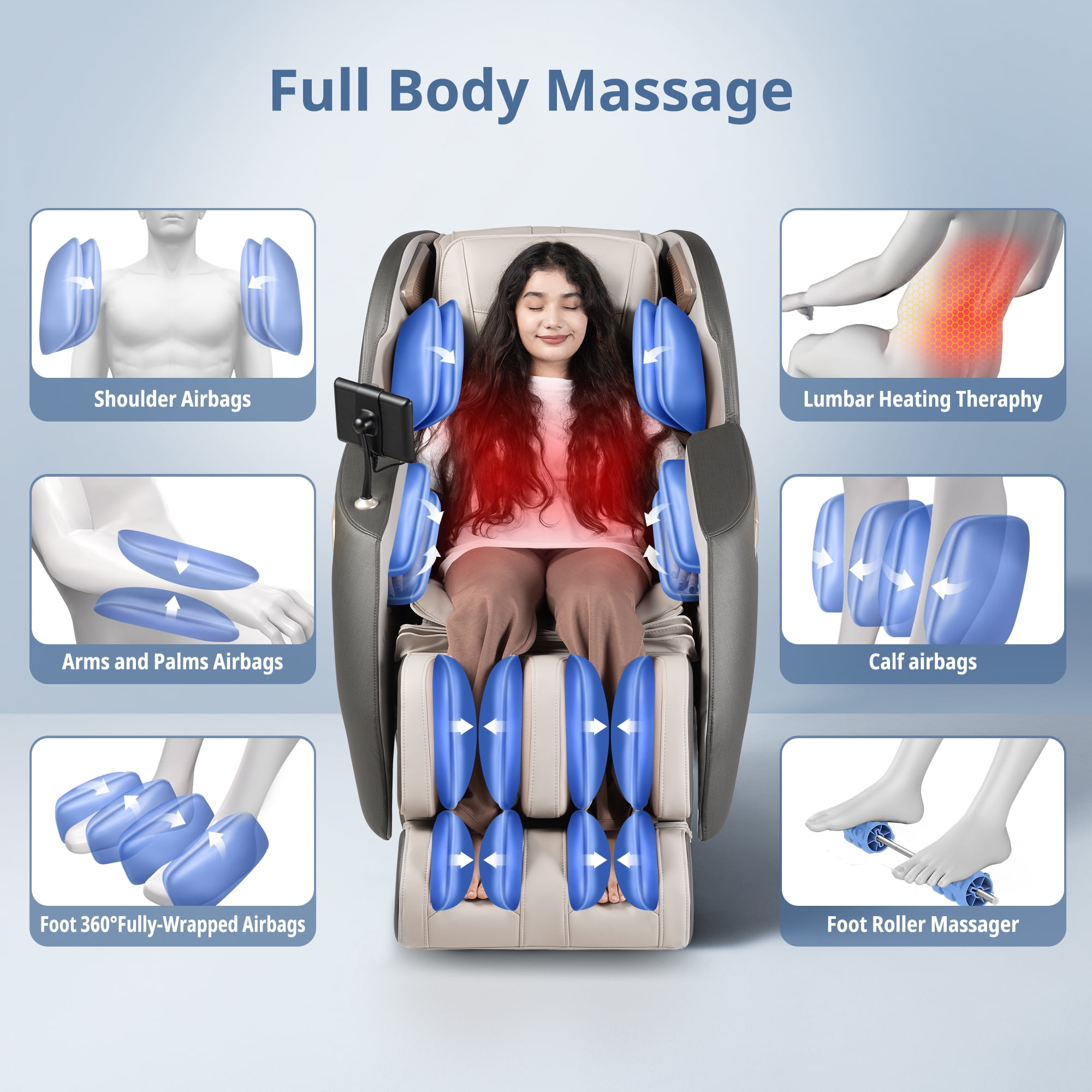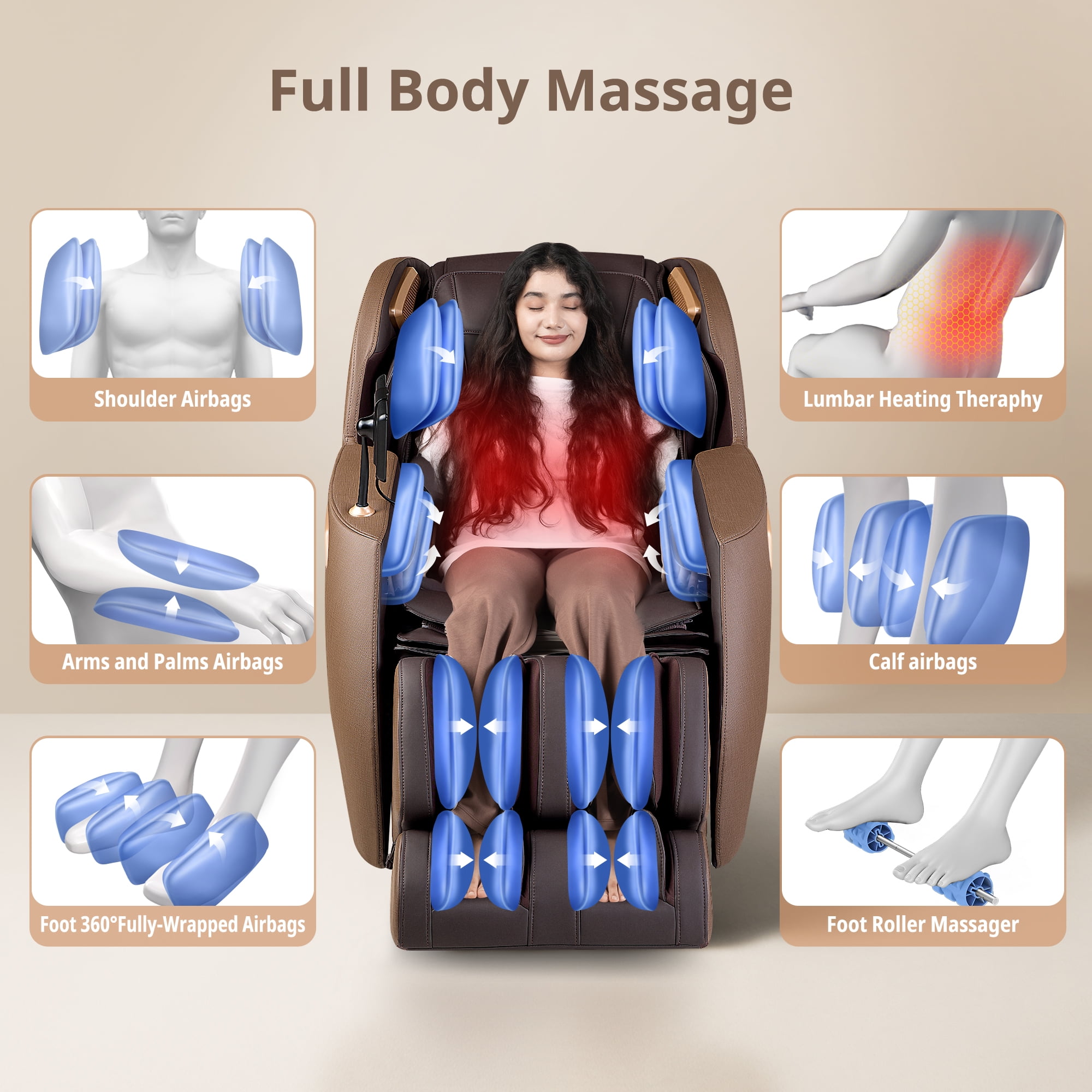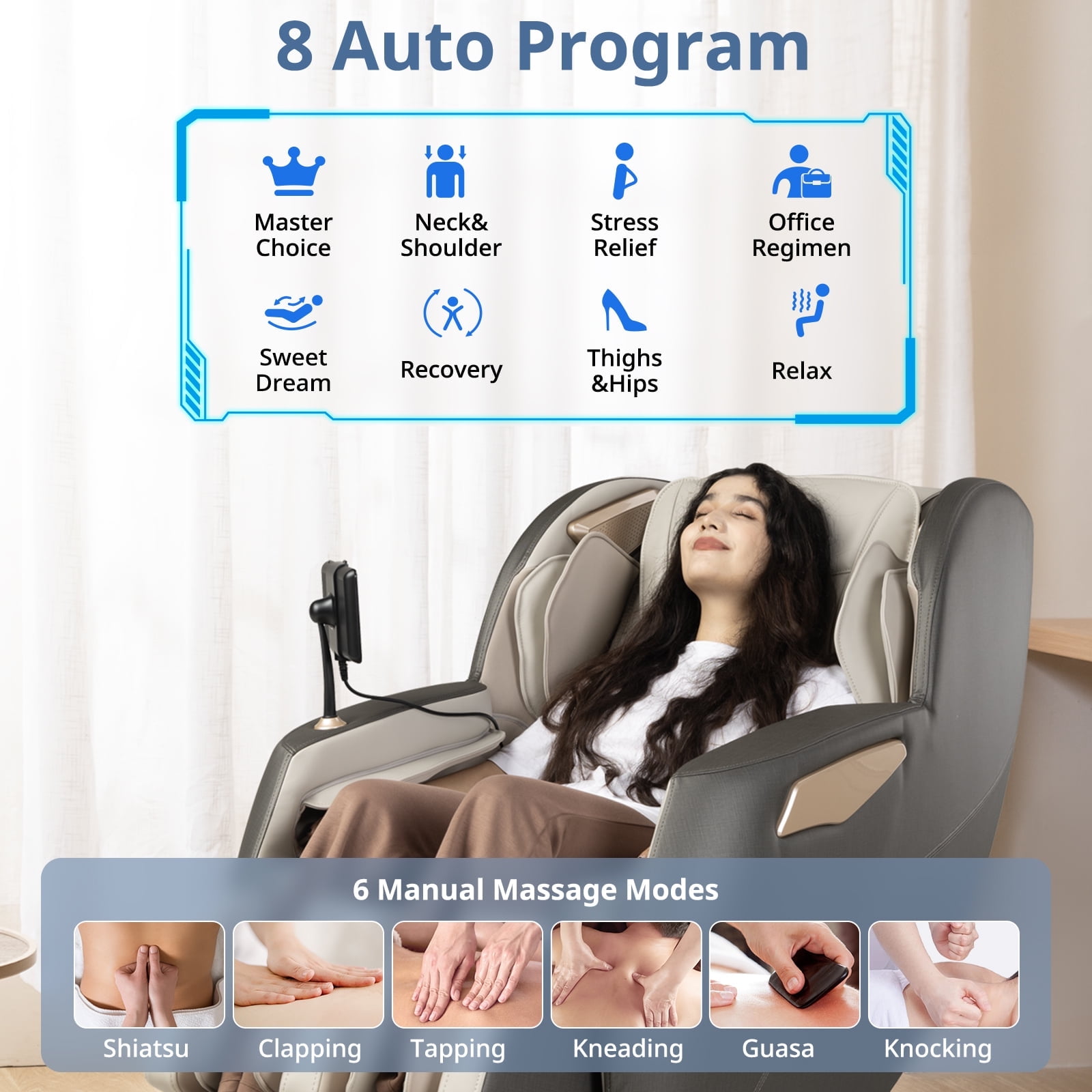 Este avanzado sillón de masaje está diseñado para ofrecer una experiencia de relajación de todo el cuerpo mediante una combinación de modos de masaje automático y manual. Presenta funciones especializadas para diferentes áreas del cuerpo, como el cuello, los hombros, la espalda y las piernas, utilizando técnicas como amasar, golpear, rodar y presionar aire. La silla también incluye configuraciones únicas como posicionamiento de gravedad cero y calefacción wika para mayor comodidad y bienestar. Con sus controles fáciles de usar y opciones de intensidad personalizables, este sillón tiene como objetivo brindar una experiencia de masaje óptima para aliviar el estrés, promover la circulación y mejorar el bienestar general.