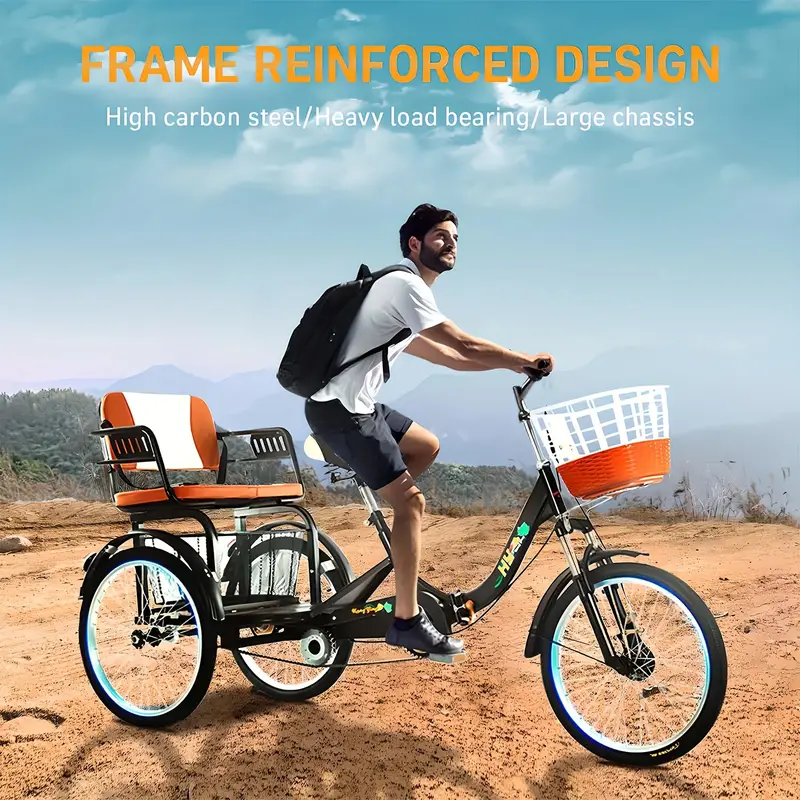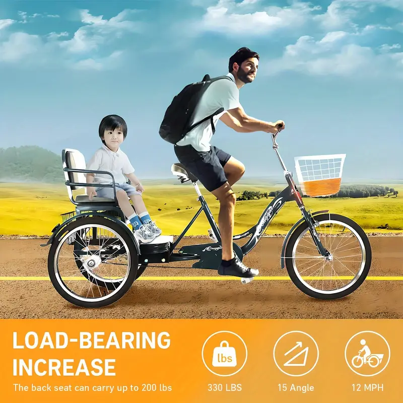 Triciclo para adultos con asiento trasero: El asiento trasero acolchado puede transportar hasta dos niños o un adulto con diseño de cinturón de seguridad, el marco de acero al carbono estable y el sistema de suspensión resistente pueden proporcionar una experiencia de conducción suave y un ciclismo más seguro.