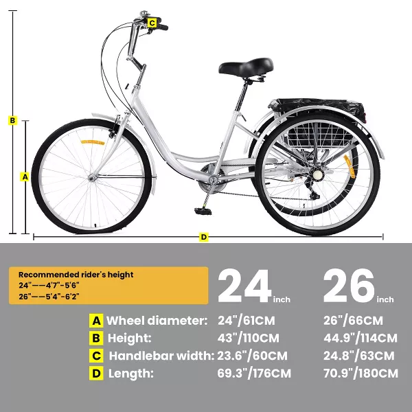[Reliable Vehicle Structure] This adult tricycle is made of high carbon steel, providing reliable support for riders weighing up to 400 pounds. Its low step through frame is easy to climb up and down, and the double chain system ensures quick assembly, allowing you to embark on your journey immediately!