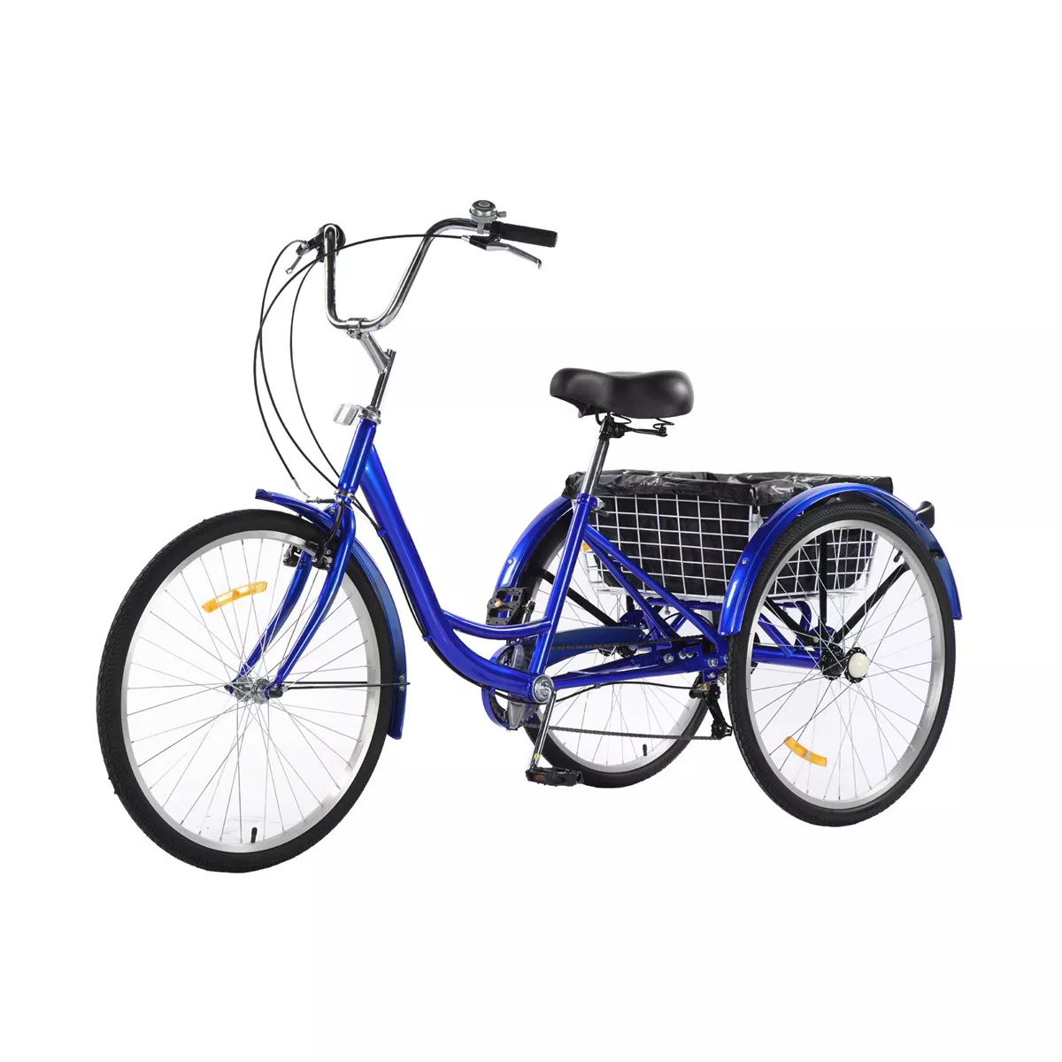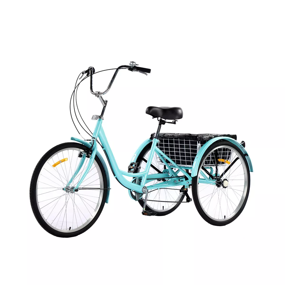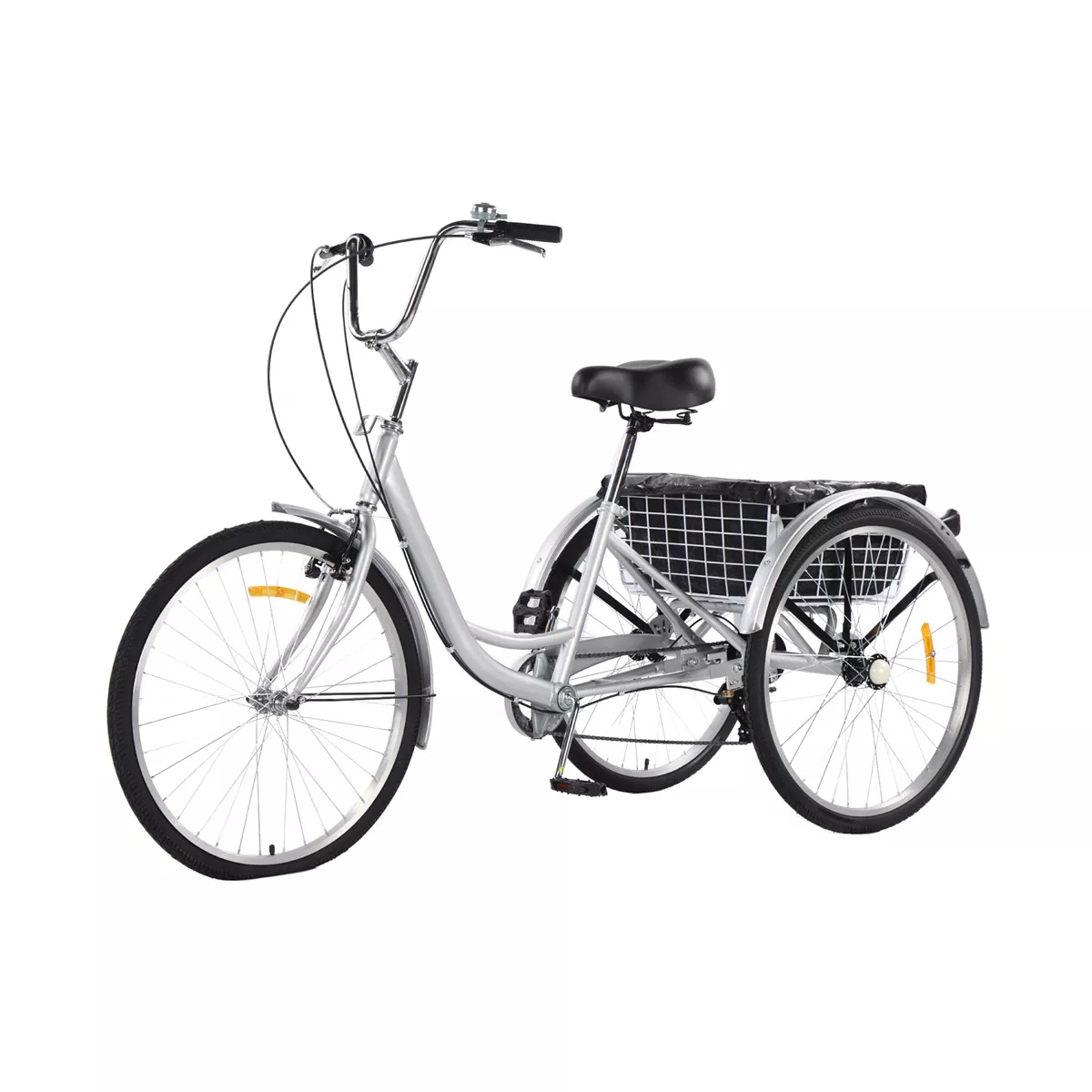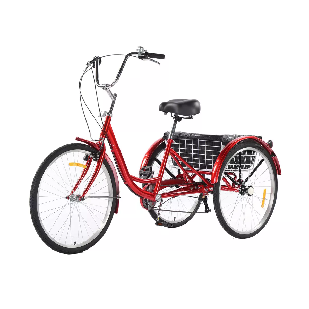 24-26" tires/ 7-speed Shimano derailleur/ rim brake/ carbon steel/ multi spoke/ 110lbs rear basket