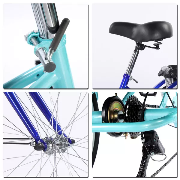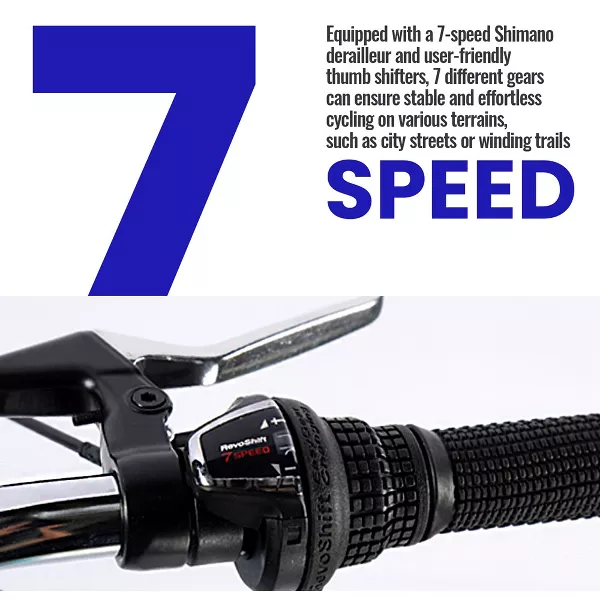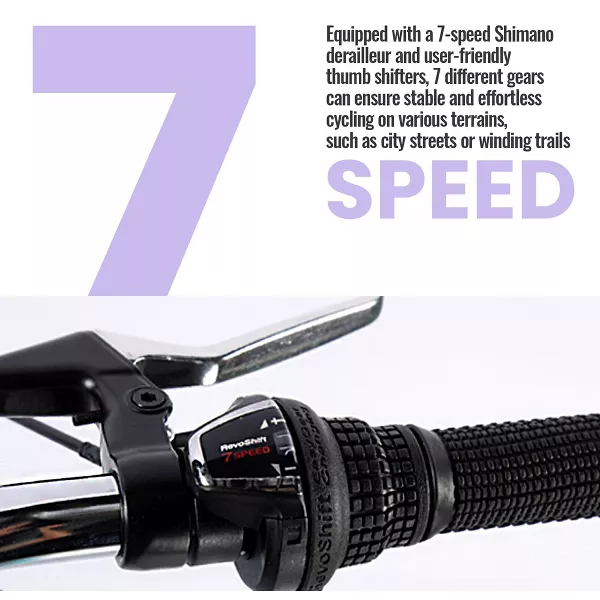 [7 speed ranges] Equipped with a 7-speed Shimano derailleur and user-friendly thumb shifters, 7 different gears can ensure stable and effortless cycling on various terrains, such as city streets or winding trails