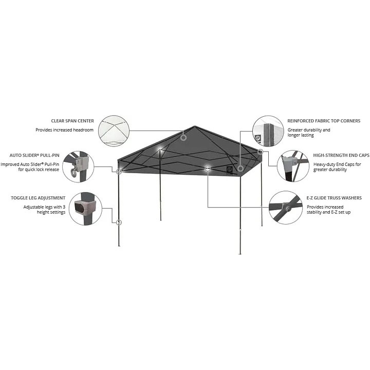 Destaca entre la multitud con el refugio instantáneo Embajador. Este refugio ligero de 10 pies x 10 pies ofrece dos alturas de patas ajustables. El centro Clear-Span proporciona el máximo espacio de cabeza sin barras transversales que obstruyen la distancia máxima de 112 pulgadas. Los ajustes de las patas de palanca y los pasadores deslizantes automáticos hacen que la configuración y la ruptura sea rápida y sencilla sin más alfileres de empuje de los dedos. El Ambassador es el toldo portátil perfecto para tu próxima visita a la playa, evento deportivo, salida en el portón trasero o picnic