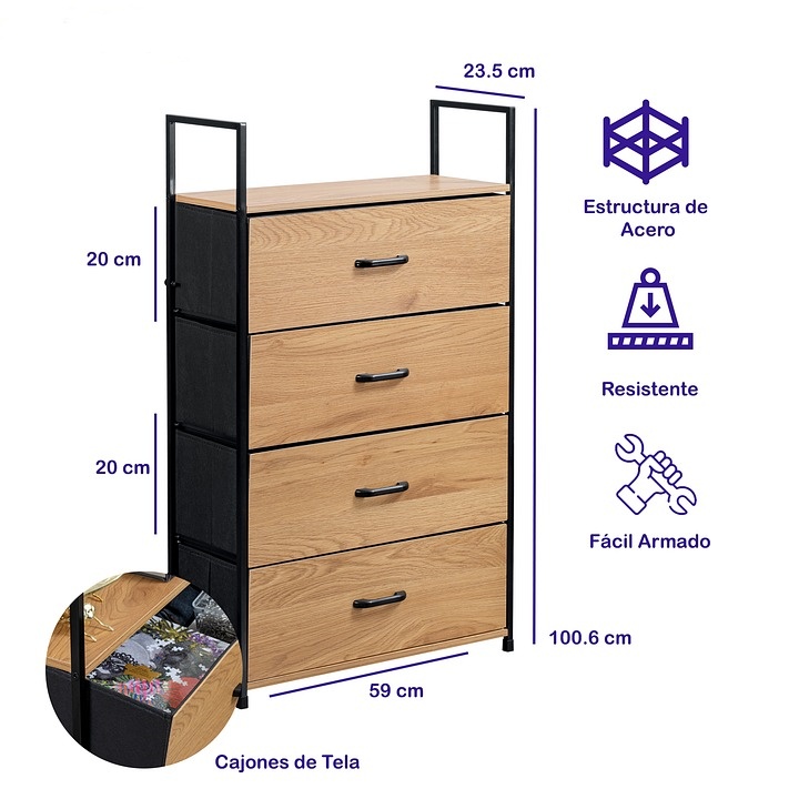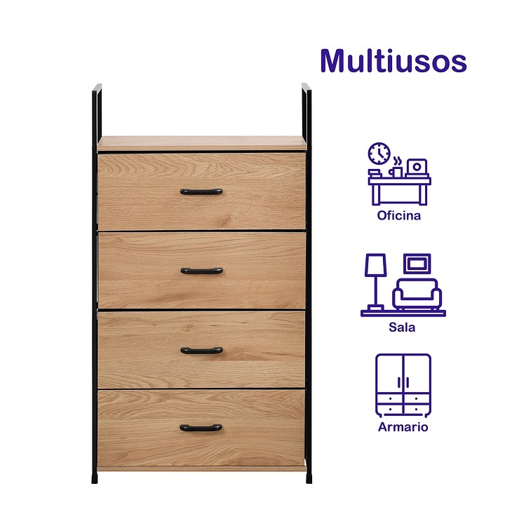 La Comoda Cajonera Lima es perfecto para ubicar en cualquier espacio de tu hogar. ¡Excelente para guardar y organizar tu armario, sala y oficina! Es un mueble con estructura de acero, melamina y tela.