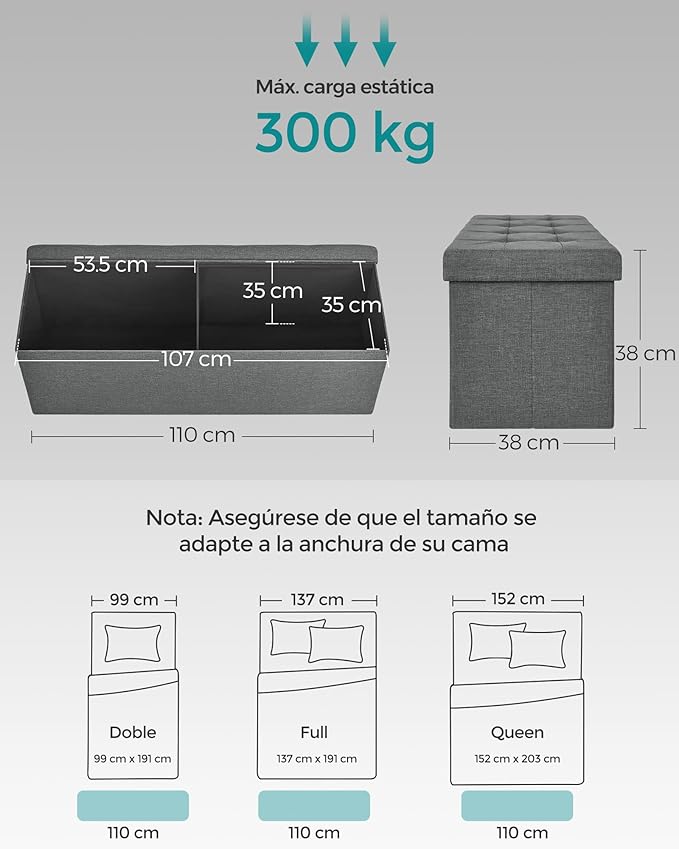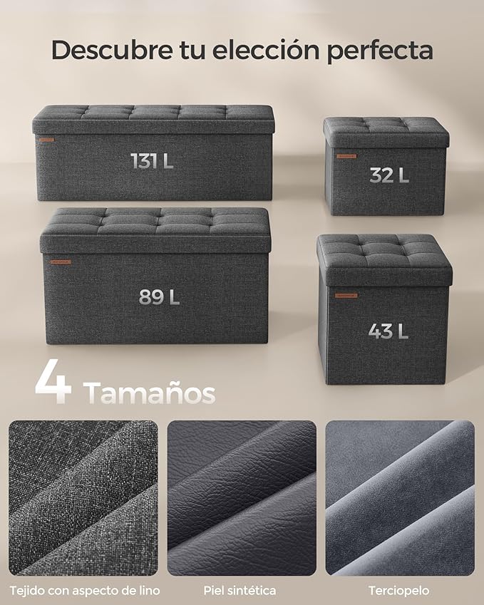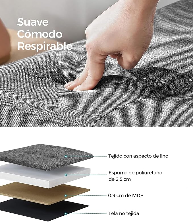 - Alto confort: El acolchado de espuma de 2.5 cm de grosor reduce la dureza de los tableros MDF y ofrece un alto confort de asiento. Y ofrece la funda transpirable de lino imitación gris claro, que también confiere a la caja un toque clásico