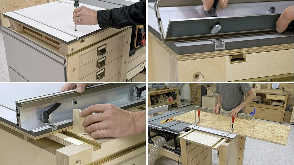 Basta con retirar los cuatro tornillos que lo fijan y utilizar dos perfiles en T para fijar este tope-guía de aluminio.Ideal para cortar piezas relativamente grandes. También puede cortar piezas en ángulo y sujetarlas con abrazaderas.