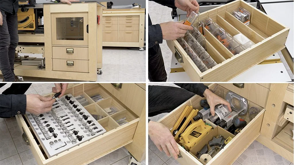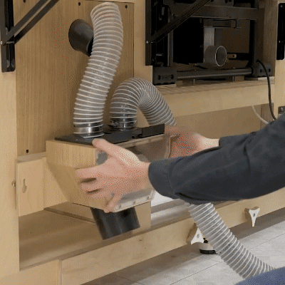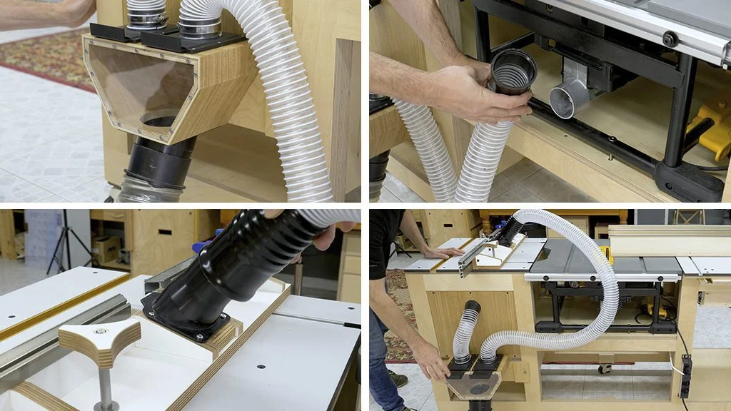 una con un manguito para conectarla a la sierra de mesa y la otra directamente al armario de la mesa de fresado,