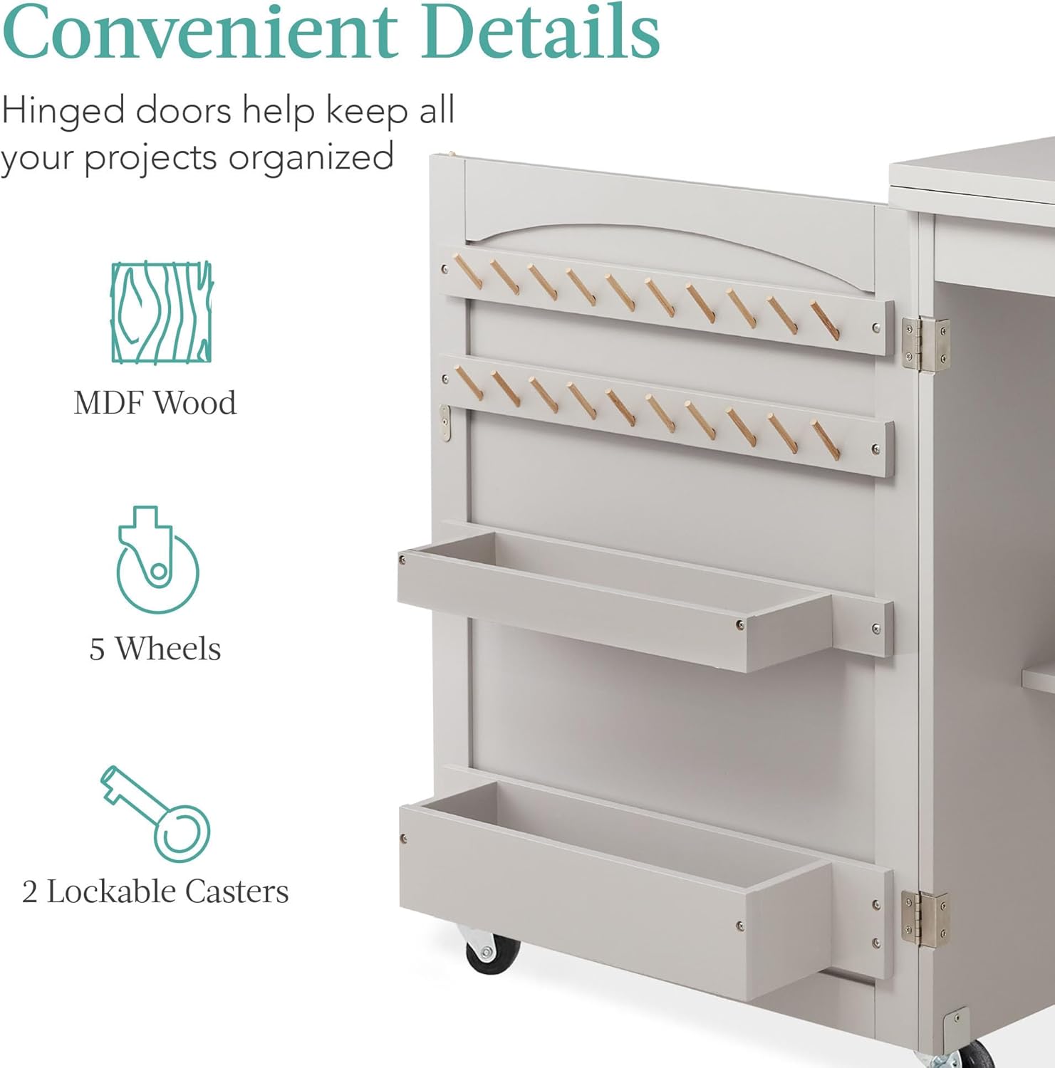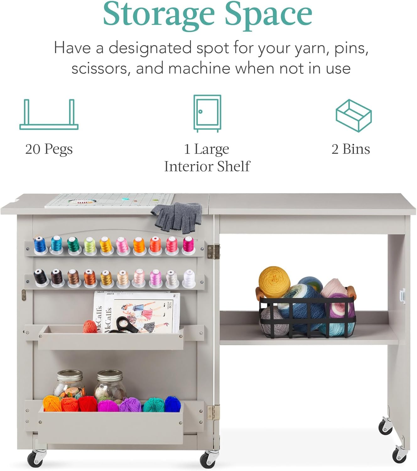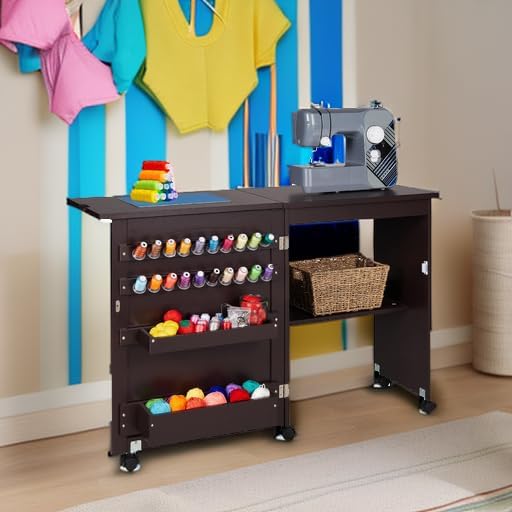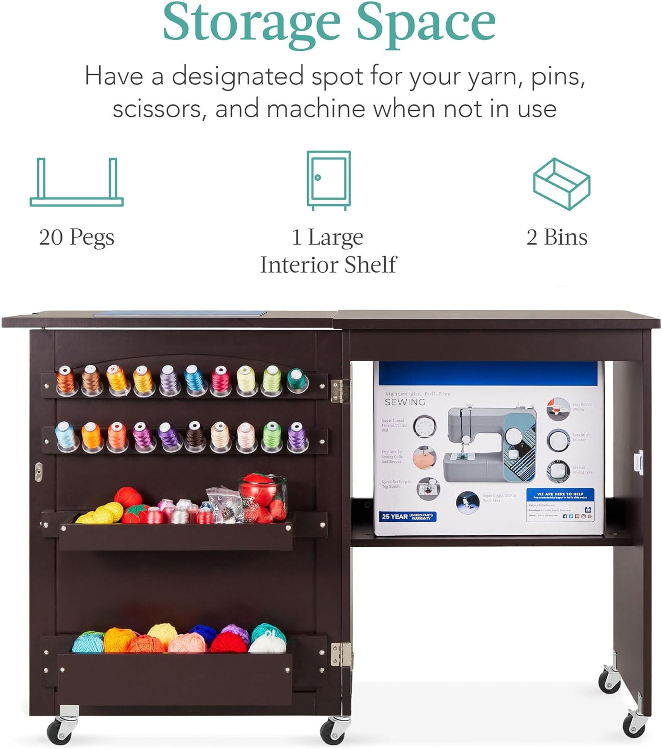 - Espacio de almacenamiento: Crea piezas de moda en una brisa con un lugar designado para hilo, alfileres, tijeras y materiales en 2 filas de clavijas, 2 espacios de almacenamiento adjuntas, 1 estante interior grande y un gran espacio de mesa.