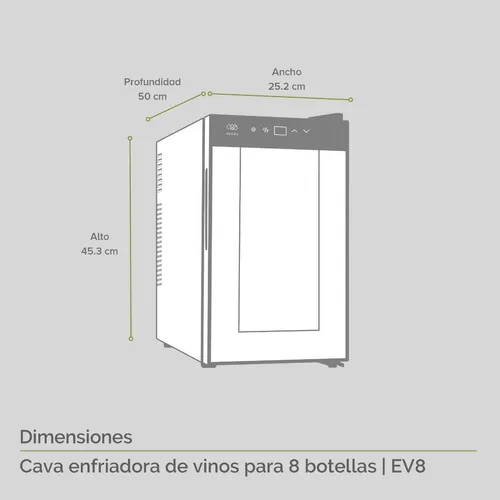 El enfriador de vino de 8 botellas cuenta con marco de acero inoxidable negro, puerta de vidrio y manija oculta que aportan elegancia a cualquier espacio.