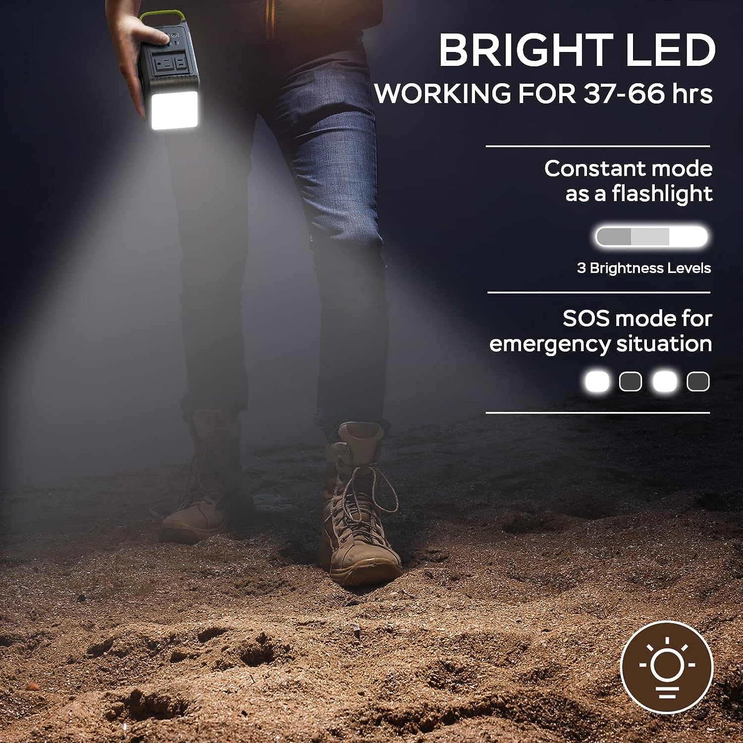 - Luces brillantes: con tres niveles de brillo, el banco de energía portátil se puede utilizar como una linterna profesional cuando sea necesario, lo que es muy adecuado para su uso cuando el coche se rompe, corte de energía en casa o una fuente de alimentación de tienda. El primer nivel se puede utilizar durante 68 horas (iluminar una habitación pequeña), el segundo nivel se puede utilizar durante 48 horas (iluminación para caminar por la noche), y el tercer nivel se puede utilizar durante 37 horas (iluminar la sala de estar). Hay modo SOS, utiliza la frecuencia SOS internacional para obtener ayuda.