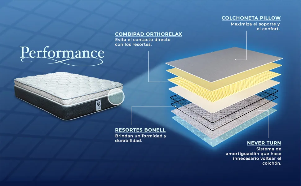 • TECNOLOGÍA PERFORMANCE: Resortes continuos que ofrecen mayor estabilidad y durabilidad.