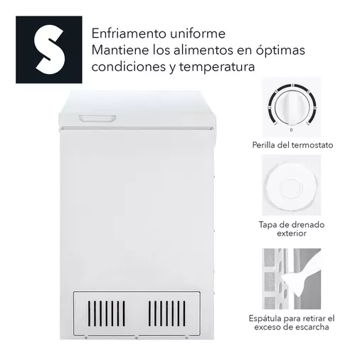 - Cuenta con una tapa de drenado exterior, que permite un drenaje sencillo de agua acumulada, lo cual facilita mantener el congelador limpio y en buen estado.