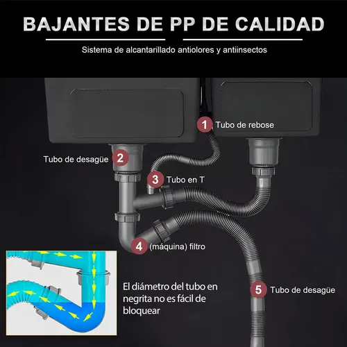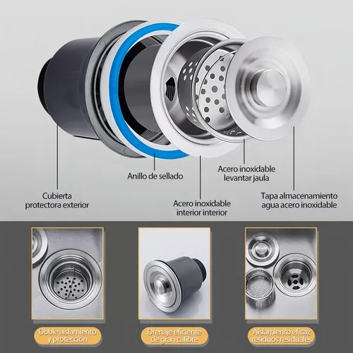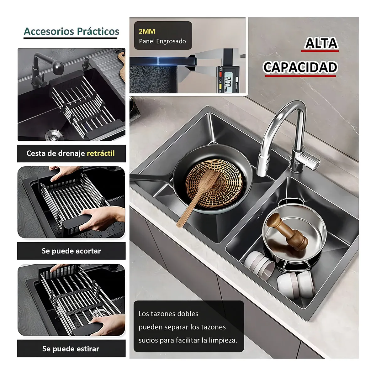 El conjunto incluye una cesta retráctil, ideal para escurrir utensilios y alimentos, manteniendo la encimera ordenada y limpia. El diseño anti-rasguños protege la superficie del fregadero de daños, manteniendo su apariencia como nueva. Además, el sistema de alcantarillado antiolores y antiinsectos garantiza un ambiente limpio e higiénico, evitando malos olores y plagas en la cocina.
