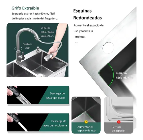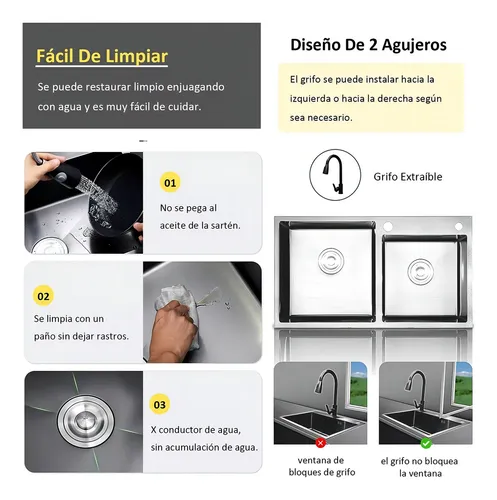 El fregadero está fabricado en acero inoxidable 304, conocido por su resistencia a la corrosión y durabilidad, asegurando una larga vida útil y un aspecto impecable a lo largo del tiempo. Las dos cubetas permiten realizar múltiples tareas simultáneamente, como lavar y enjuagar, aumentando la eficiencia en la cocina. El grifo extraíble facilita el acceso a todas las áreas del fregadero, permitiendo llenar ollas grandes y lavar alimentos con mayor comodidad.