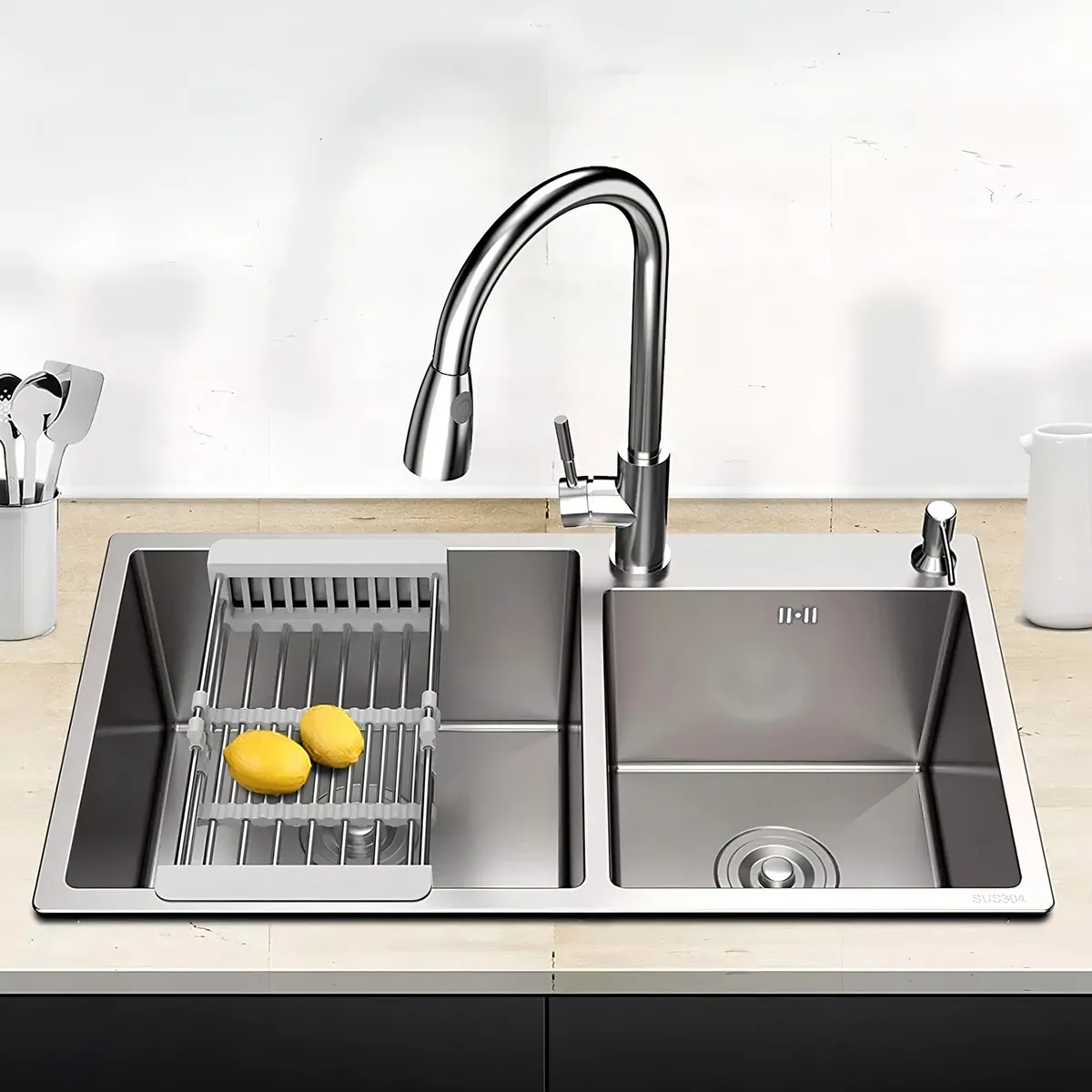 Transforma tu cocina con el fregadero de cocina de tarja doble con cubeta de acero inoxidable 304. Este conjunto completo incluye un grifo extraíble, ofreciendo alta capacidad y versatilidad. Ideal para cualquier cocina moderna, este fregadero combina funcionalidad y durabilidad con un diseño elegante.