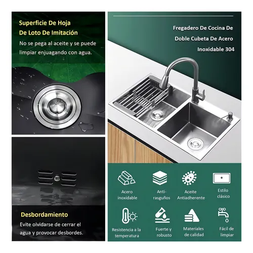 Ideal para cualquier hogar, el fregadero de cocina de tarja doble con cubeta de acero inoxidable 304 es la solución perfecta para aquellos que buscan calidad, durabilidad y un diseño elegante. Completa tu cocina con este conjunto que ofrece alta capacidad, facilidad de limpieza y una experiencia de uso superior, garantizando satisfacción y practicidad en cada uso.