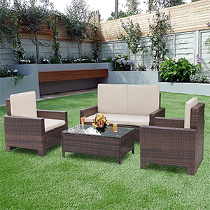 - El juego de 4 piezas incluye: 1 sofá de dos plazas, 2 sillones, 1 mesa de centro, 1 parte superior de vidrio templado y 8 cojines (requiere montaje)