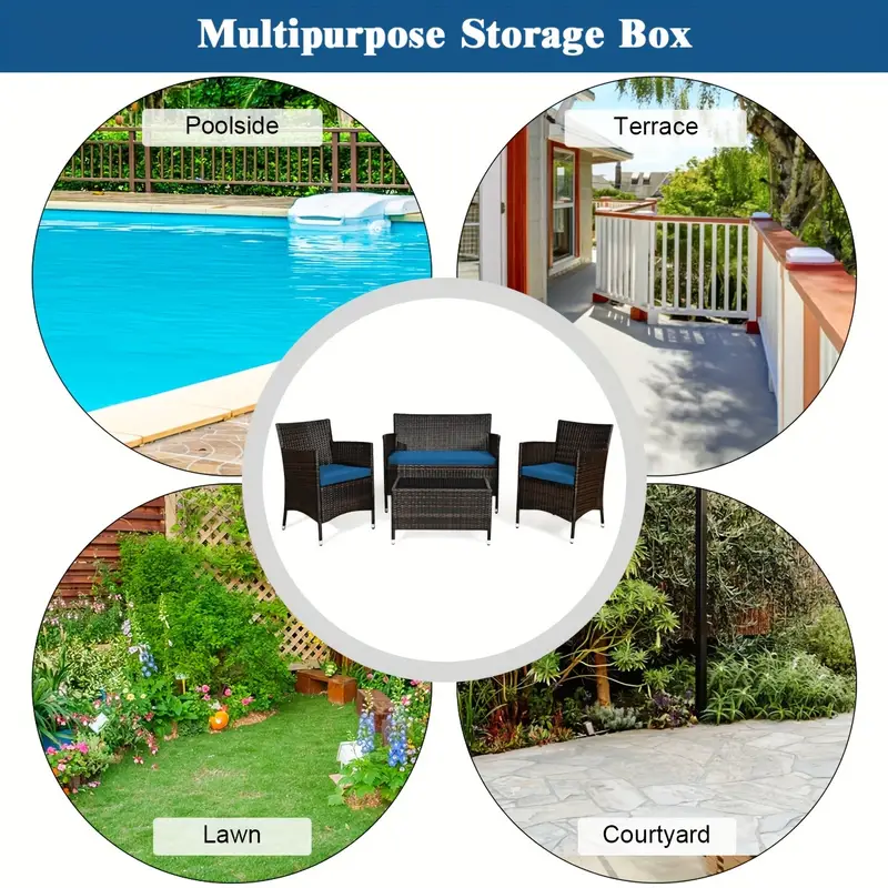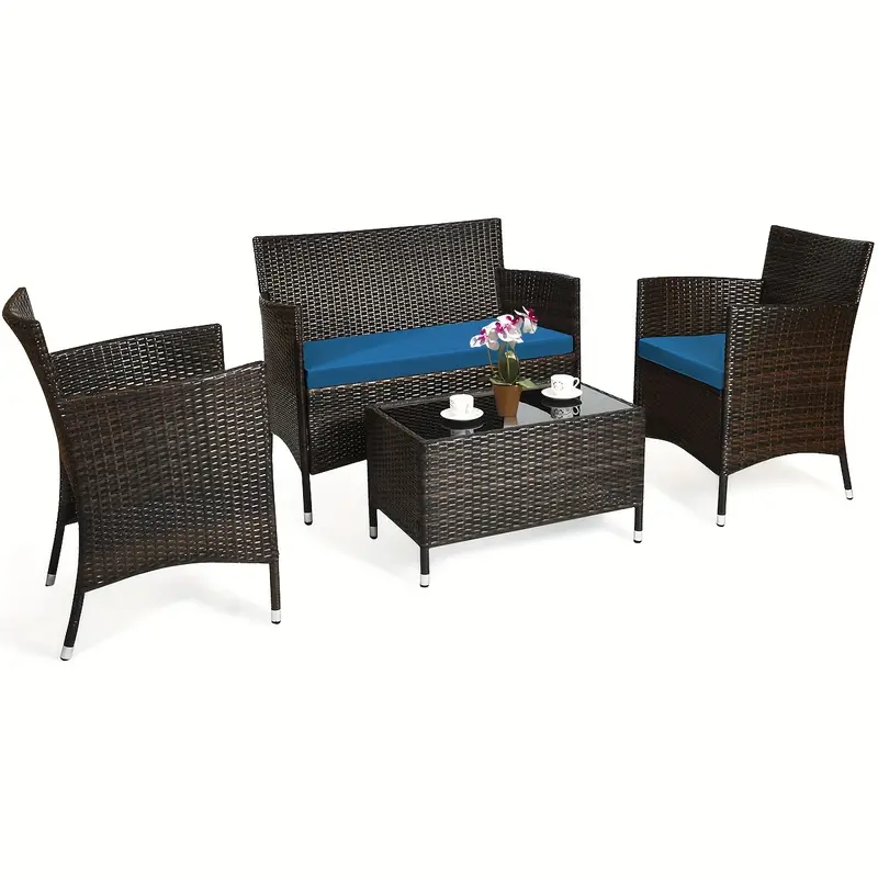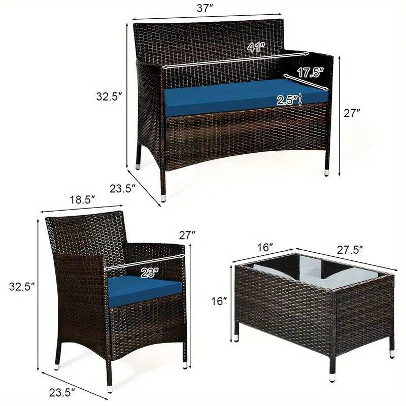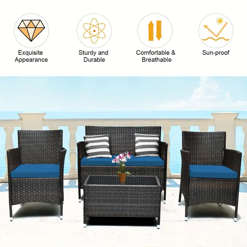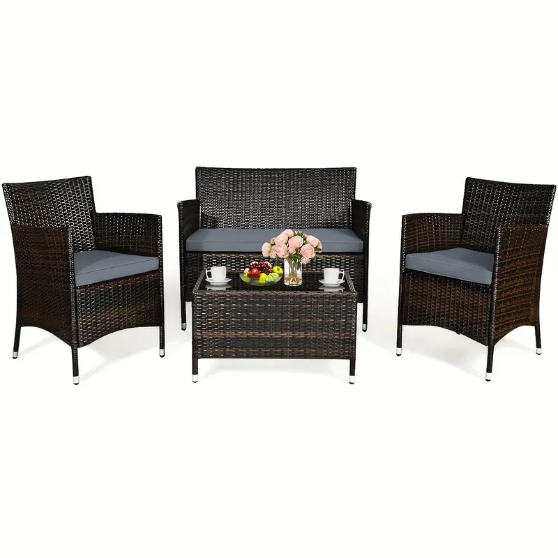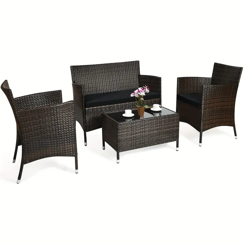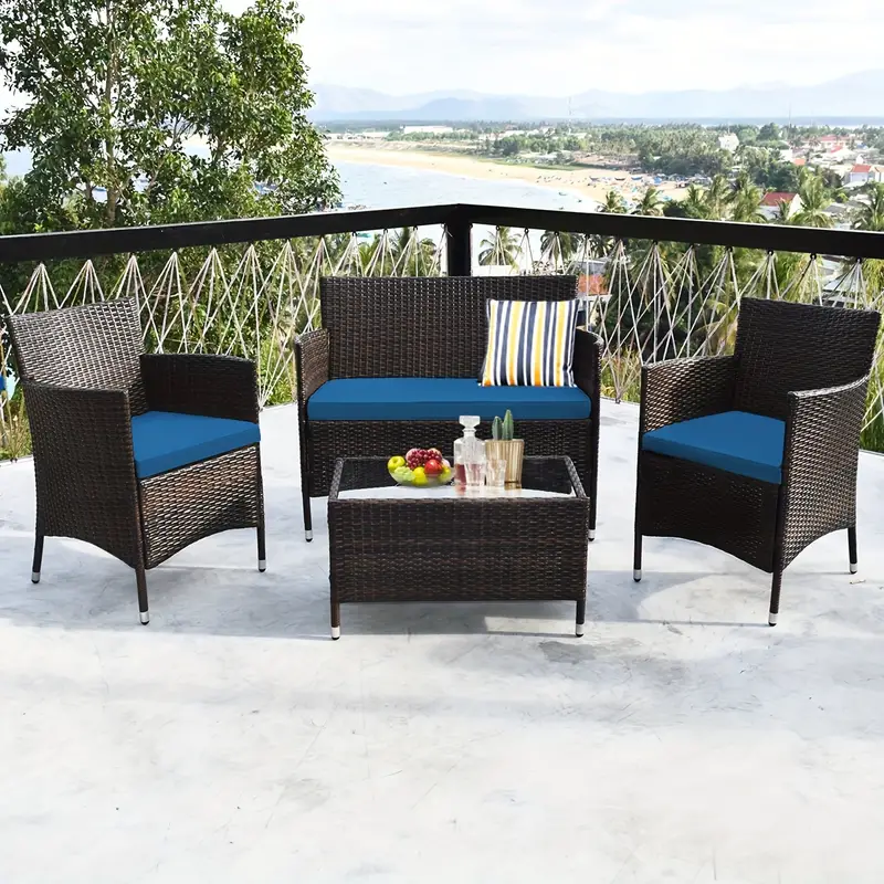 Nuestro juego de sofá de ratán de 4 piezas te brindará la experiencia casual más cómoda. Fabricado con un resistente marco de acero, el juego es lo suficientemente duradero como para ser tu elección a largo plazo. El exquisito ratán con una fuerte resistencia también te brindará una buena sensación. El suave cojín de esponja también puede ayudar a relajar completamente tu cuerpo. Este juego de muebles de exterior de mimbre puede combinar con cualquier estilo de hogar, lo que lo convierte en una buena opción para salas de estar, porches, bordes de piscinas o jardines.