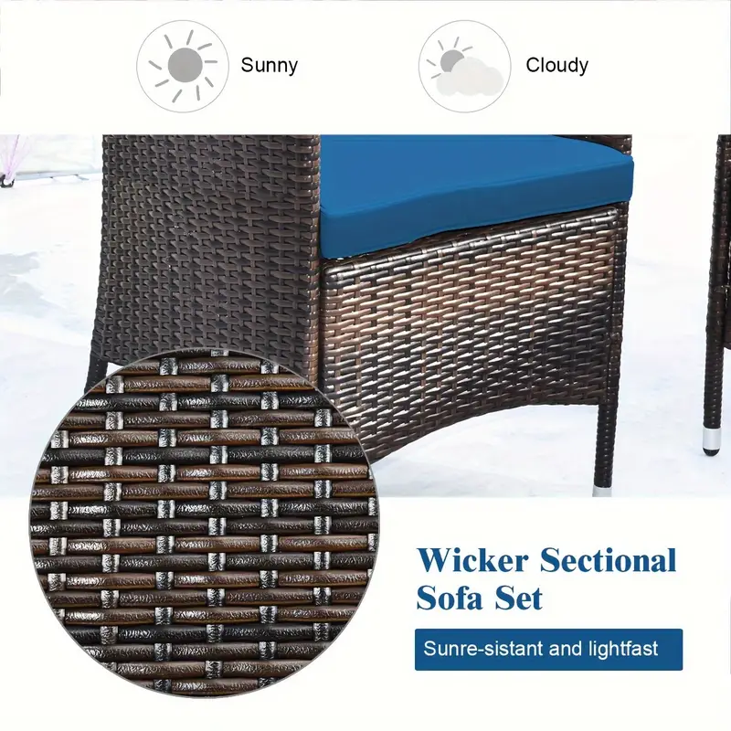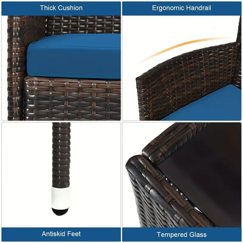 Hecho de ratán con buena resistencia y función resistente a la intemperie. Estructura de acero reforzado con excelente estabilidad. Cojines de asiento para una sensación suave y cómoda al sentarse. Mesa de café con cristal templado para un soporte resistente. Sofá seccional para reorganizar en diferentes combinaciones. Respaldo ergonómico y pasamanos para lograr una relajación definitiva. Sofá amplio para acostarse, jugar y reunirse. Patas antideslizantes para proteger el piso de arañazos.