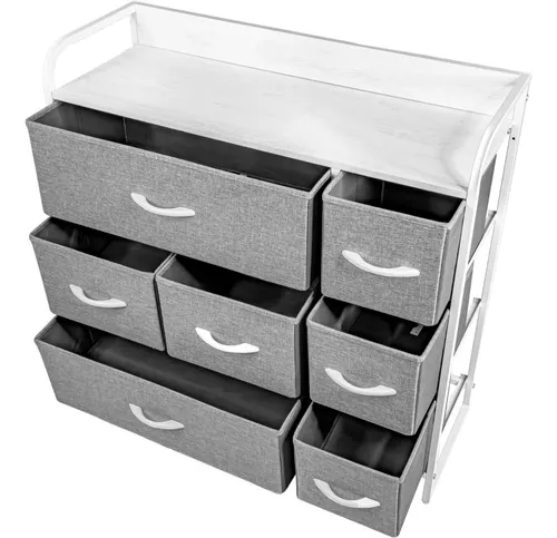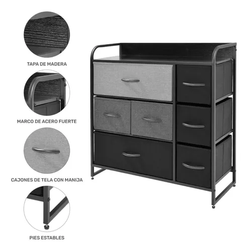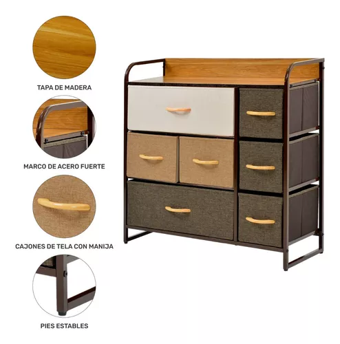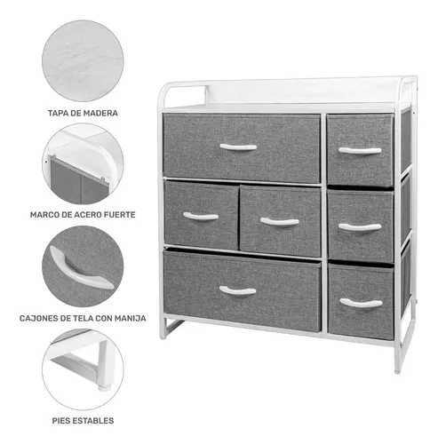 • Diseño innovador con 7 cajones espaciosos para una solución de almacenamiento óptima y conveniente. Cada cajón está revestido con tela de alta calidad, brindando un toque de elegancia y suavidad al diseño. Capacidad de carga de hasta 70 kg.