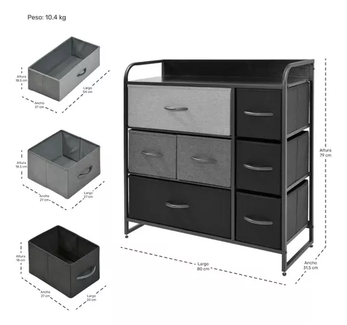 • Distribución eficiente con dimensiones generales de 80x31.5x79cm. Los cajones pequeños de 20x27x18cm, los cajones medianos de 27x27x18.5cm y los cajones grandes de 54x27x18.5cm ofrecen una distribución eficiente para organizar artículos de distintos tamaños.