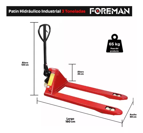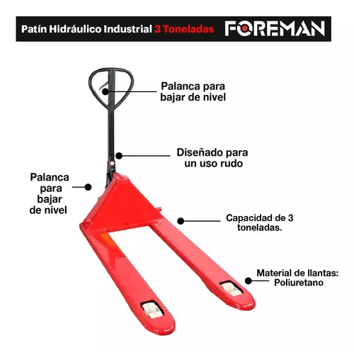 Su capacidad de carga de hasta 3 toneladas permite mover tarimas y pallets de manera eficiente, facilitando la logística y optimizando el tiempo en el transporte de mercancías. Equipado con un sistema hidráulico de alta calidad, el patín ofrece un levantamiento suave y controlado, lo que minimiza el esfuerzo físico del operador.