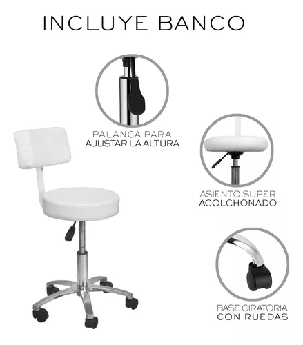 - Asiento acompañante forrado en vinipiel, base giratoria con ruedas y altura ajustable. Ángulo de reclinación de 180°.