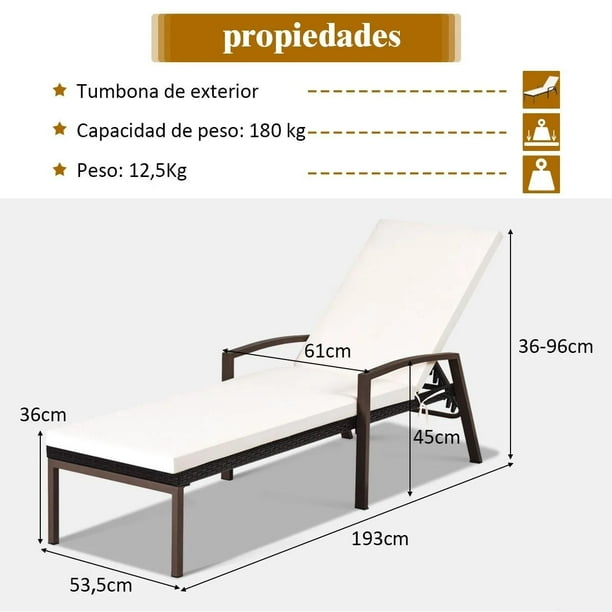 - Tamaño de la tumbona: tamaño total: 193 x 61 x 35-96 cm, distancia desde el asiento al suelo: 35 cm, distancia desde los reposabrazos al suelo: 46 cm, espesor del cojín: 5 cm, capacidad de carga: 180 kg.