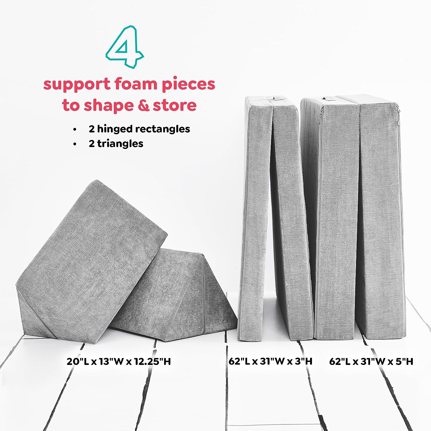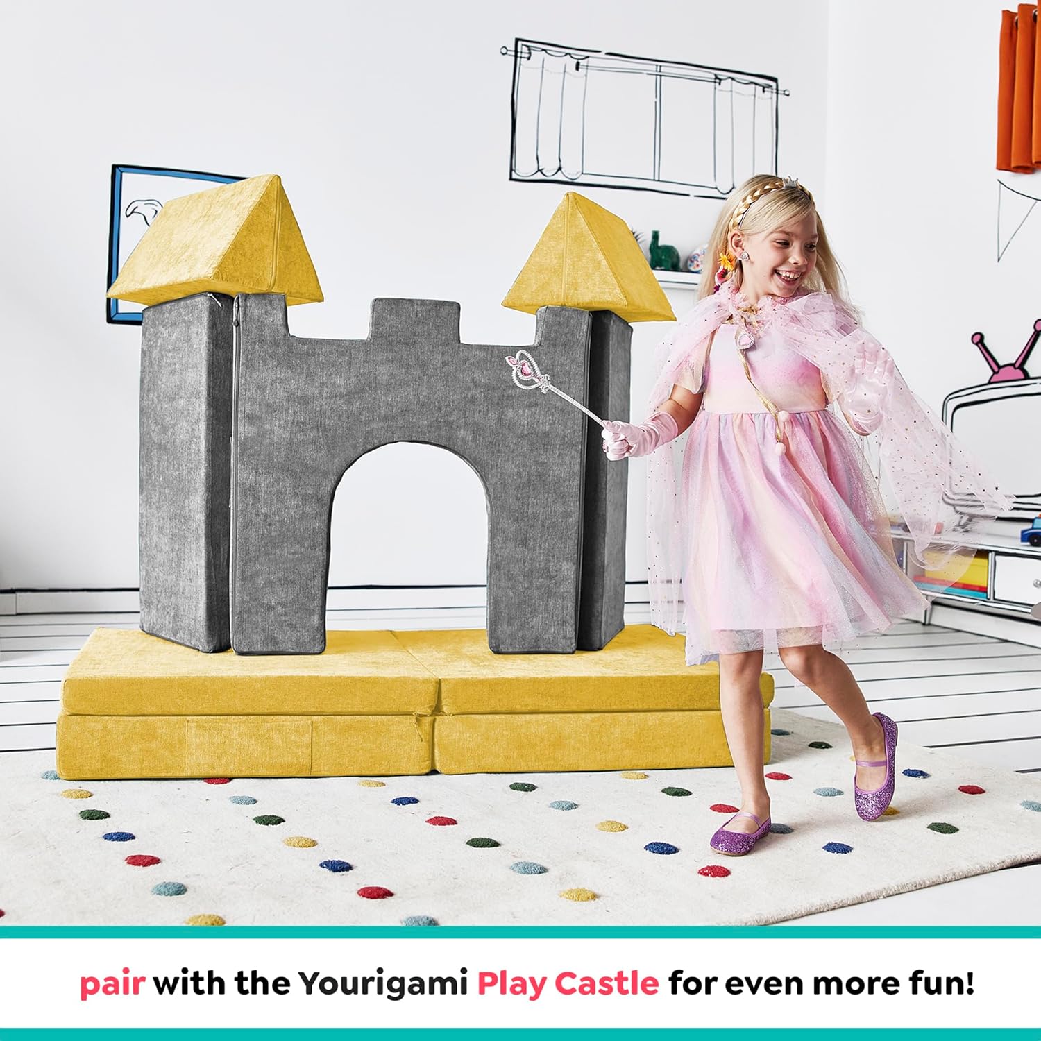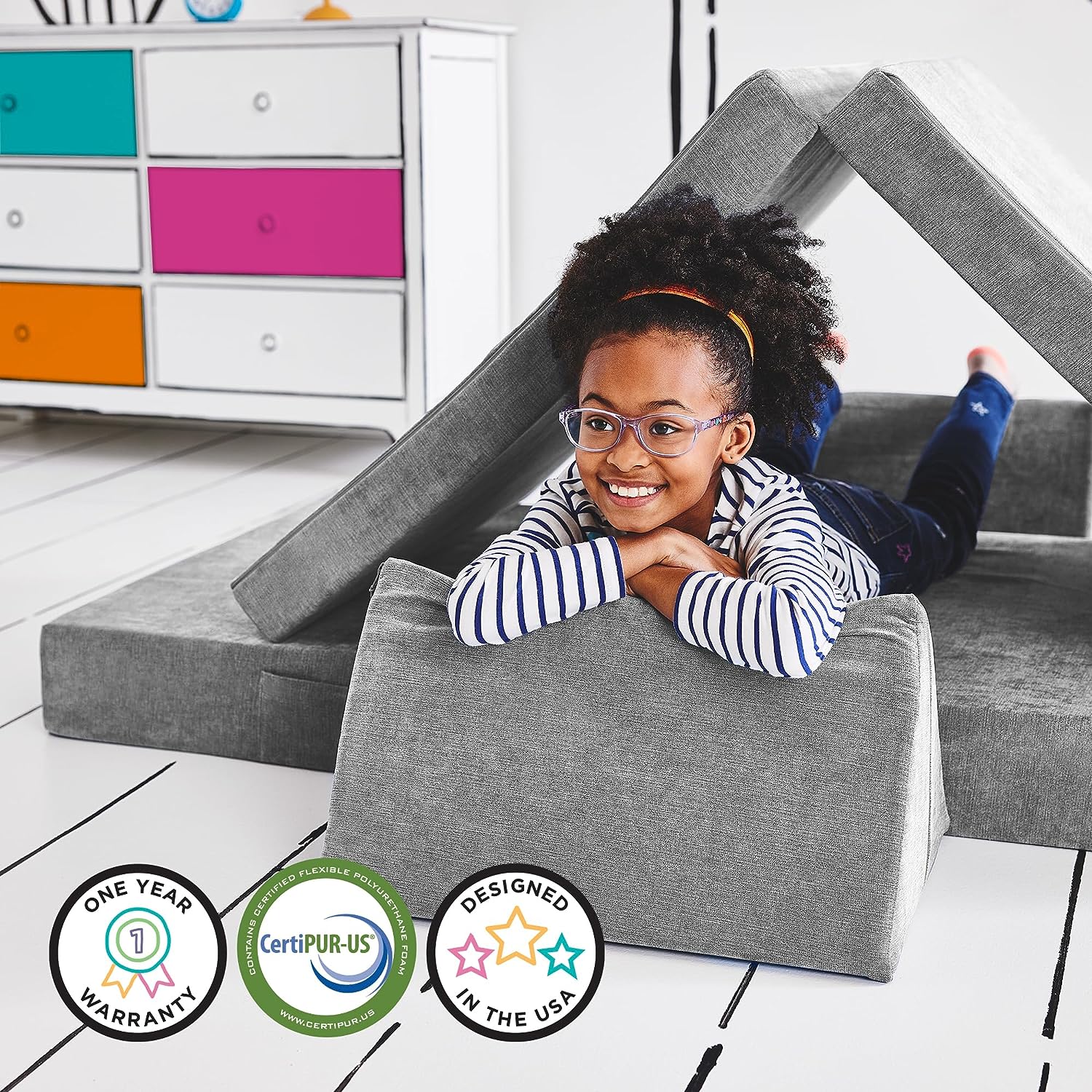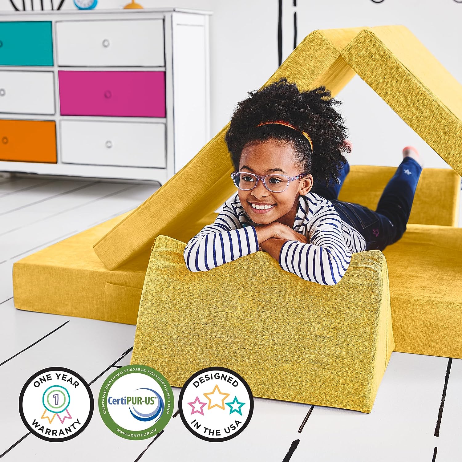 - Posibilidades infinitas: el sofá para niños YOURIGAMI Mountain Gray viene con 4 piezas modulares que se pueden transformar en innumerables formas imaginativas para descansar o jugar; las fundas de panel con bisagras también incluyen asas para un fácil movimiento y un bolsillo para guardar; combina con el castillo de juego YOURIGAMI para configuraciones de lujo más grandes e incluso aventuras más grandes