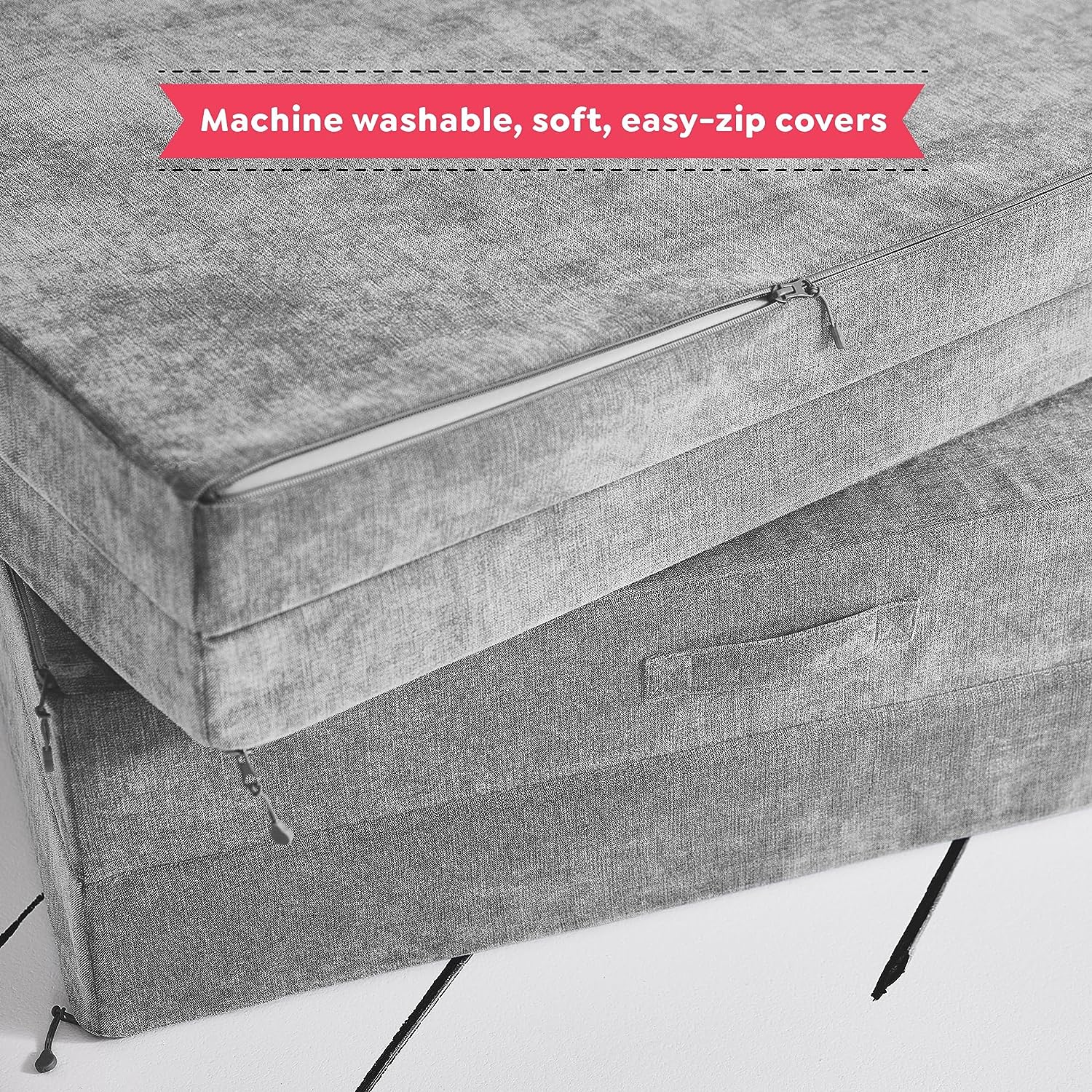 - Juega con limpieza: a veces, la sala de juegos puede ensuciarse un poco. Es por eso que cada pieza viene con una funda de cierre fácilmente extraíble que se puede lavar a máquina y secar; esto hace que refrescar los muebles de tus hijos sea un pedazo de pastel
